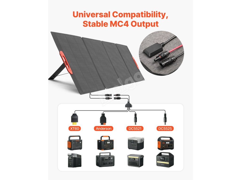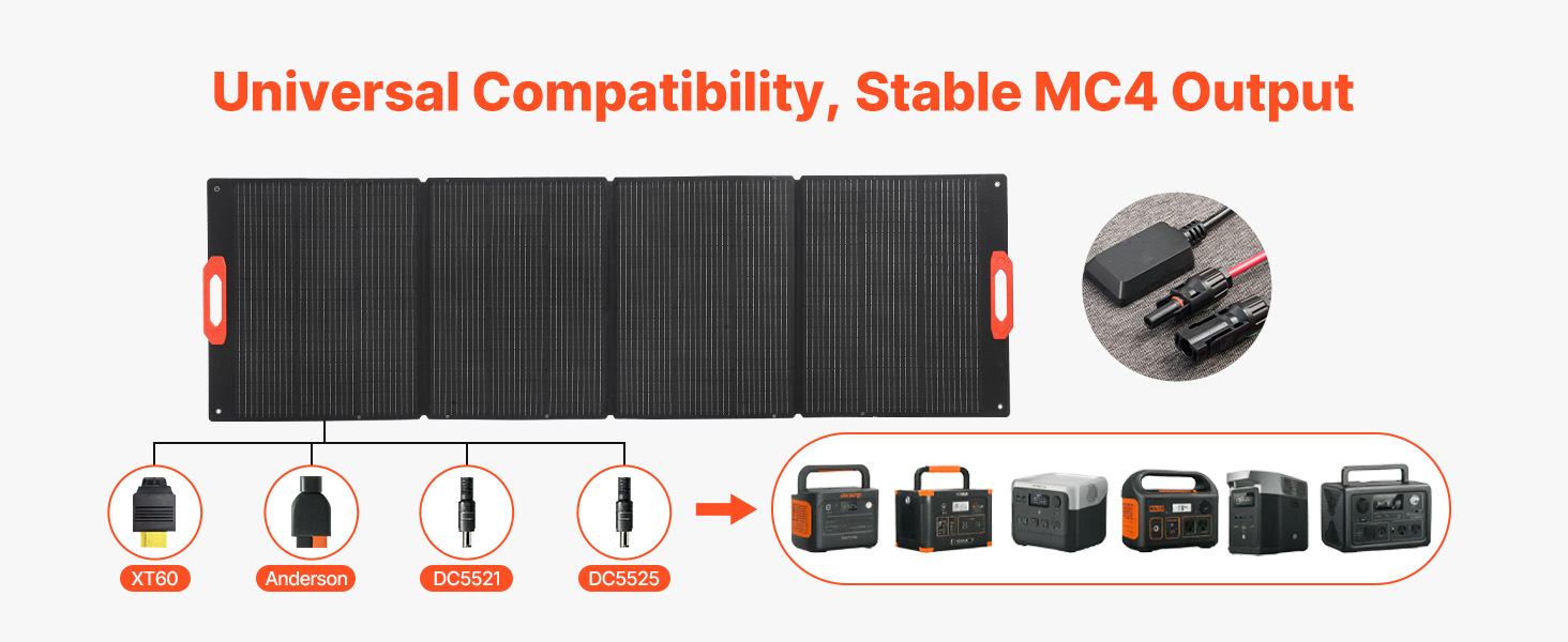 Náš solárny panel je vybavený stabilným výstupom MC4, káblom s konektorom MC4 4 v 1 (MC4 na XT60 / Anderson / DC5521 / DC5525) a adaptérom s konektorom DC 10 v 1, ktorý je široko kompatibilný s väčšinou napájacích staníc na trhu.
