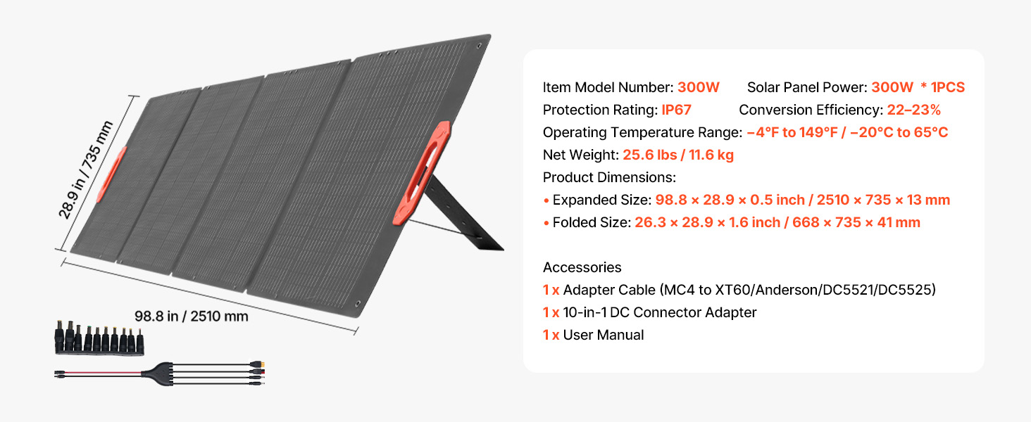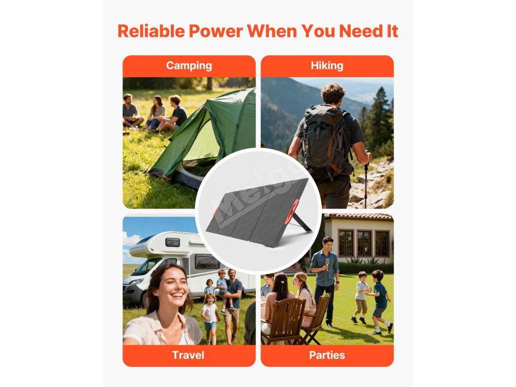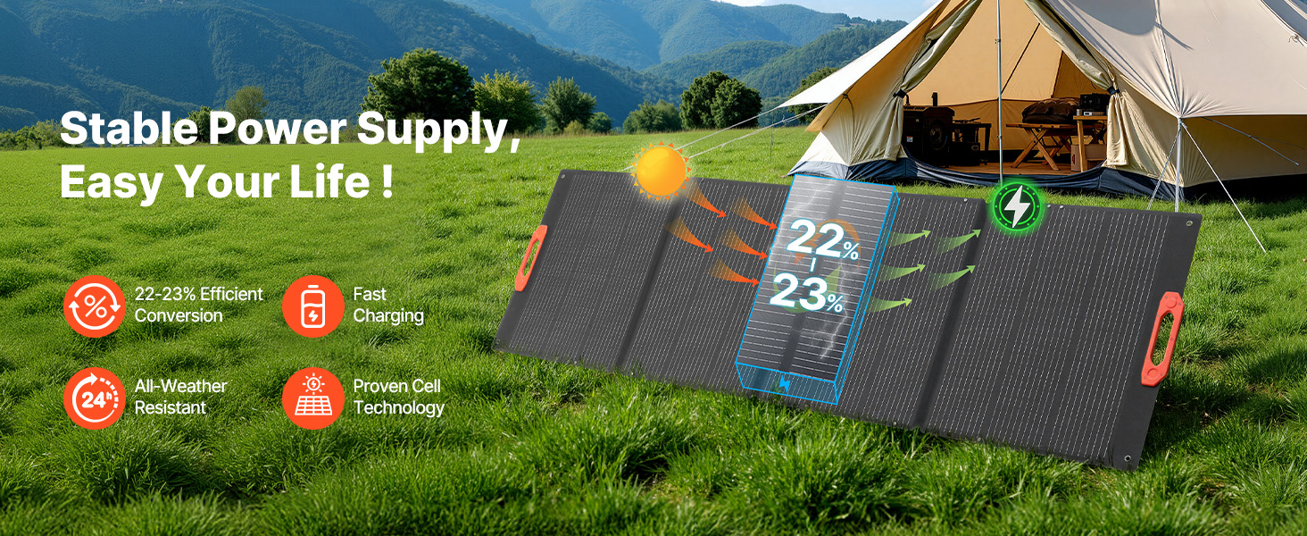 Napájajte svoje outdoorové dobrodružstvá pomocou nášho 300W prenosného skladacieho mono solárneho panelu. Je vyrobený z vysokoúčinných monokryštalických článkov a má 22-23% účinnosť konverzie, takže poskytuje spoľahlivý zdroj energie na rýchle nabíjanie zariadení - je to nevyhnutný spoločník na kempovanie, výlety s karavanom, turistiku a rybárčenie.