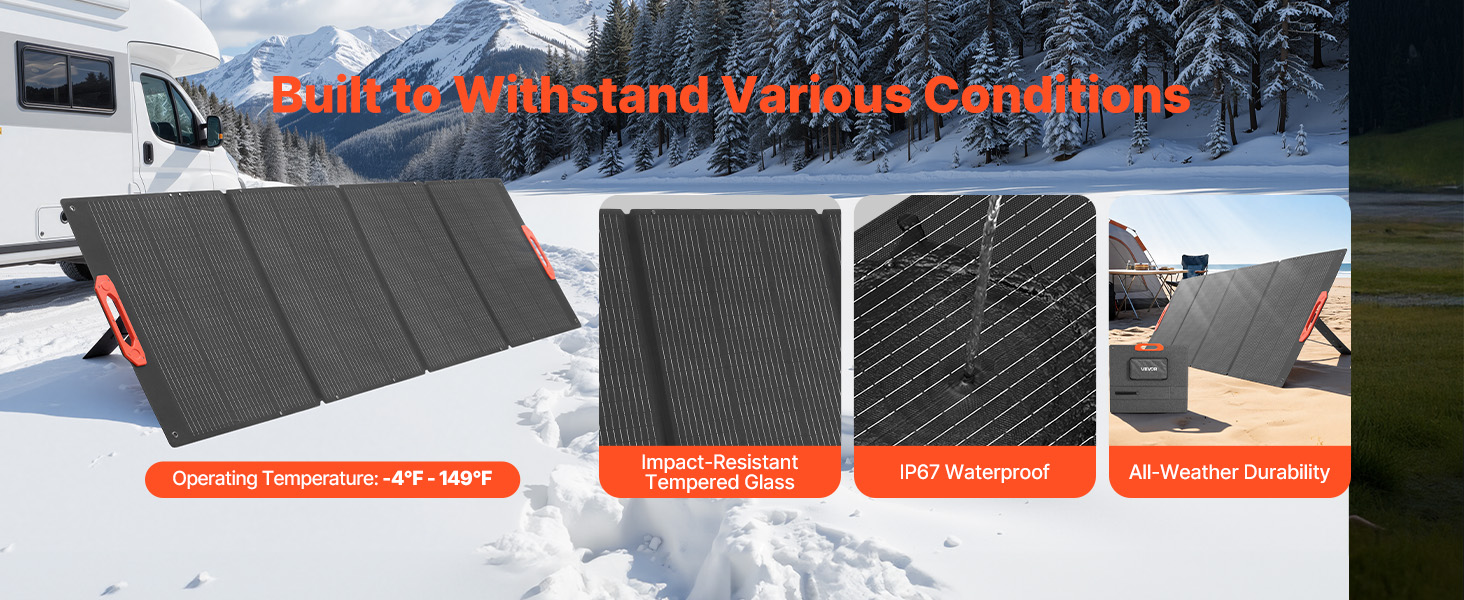 Táto nabíjačka solárnych panelov, skonštruovaná s vodotesnosťou IP67 a robustným povrchom z tvrdeného skla, spoľahlivo funguje pri teplotách od -20 °C do 65 °C (-4°F až 149°F), čím zabezpečuje stabilný a dlhodobý výkon v rôznych vonkajších prostrediach.