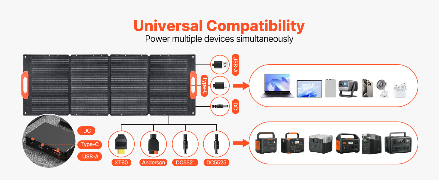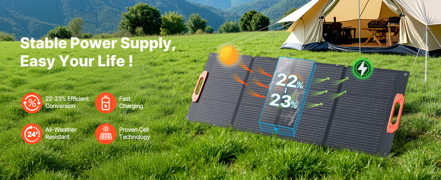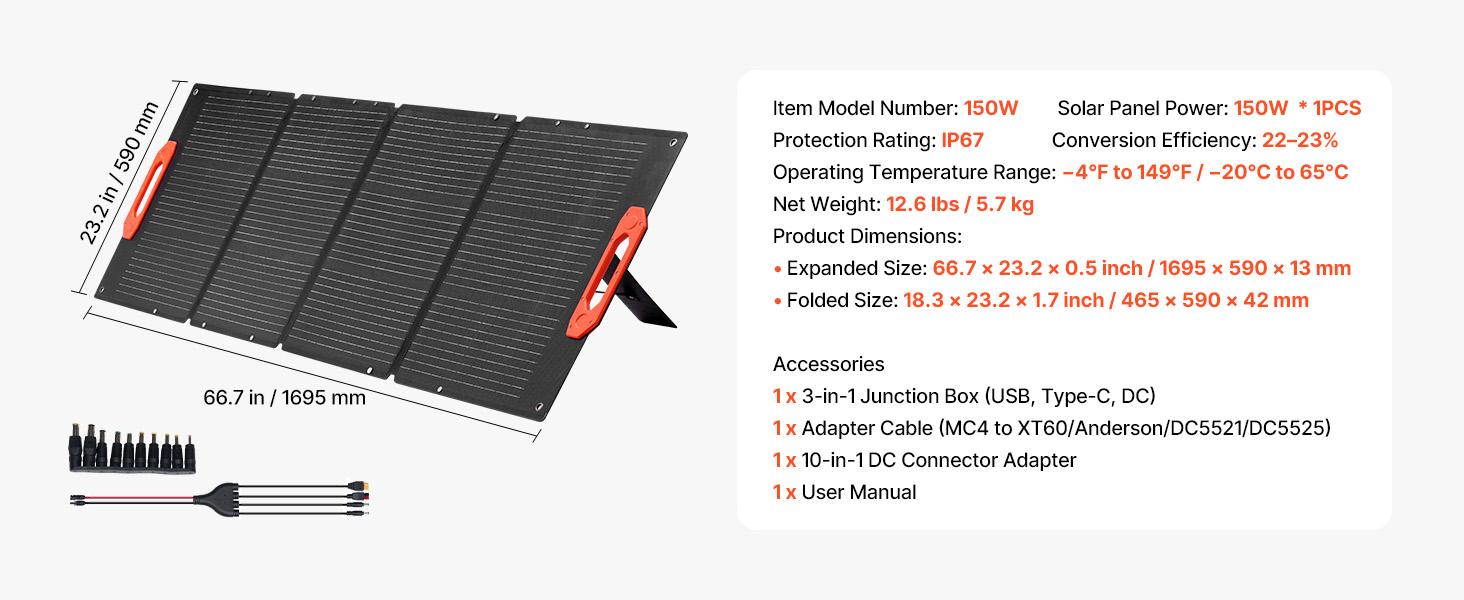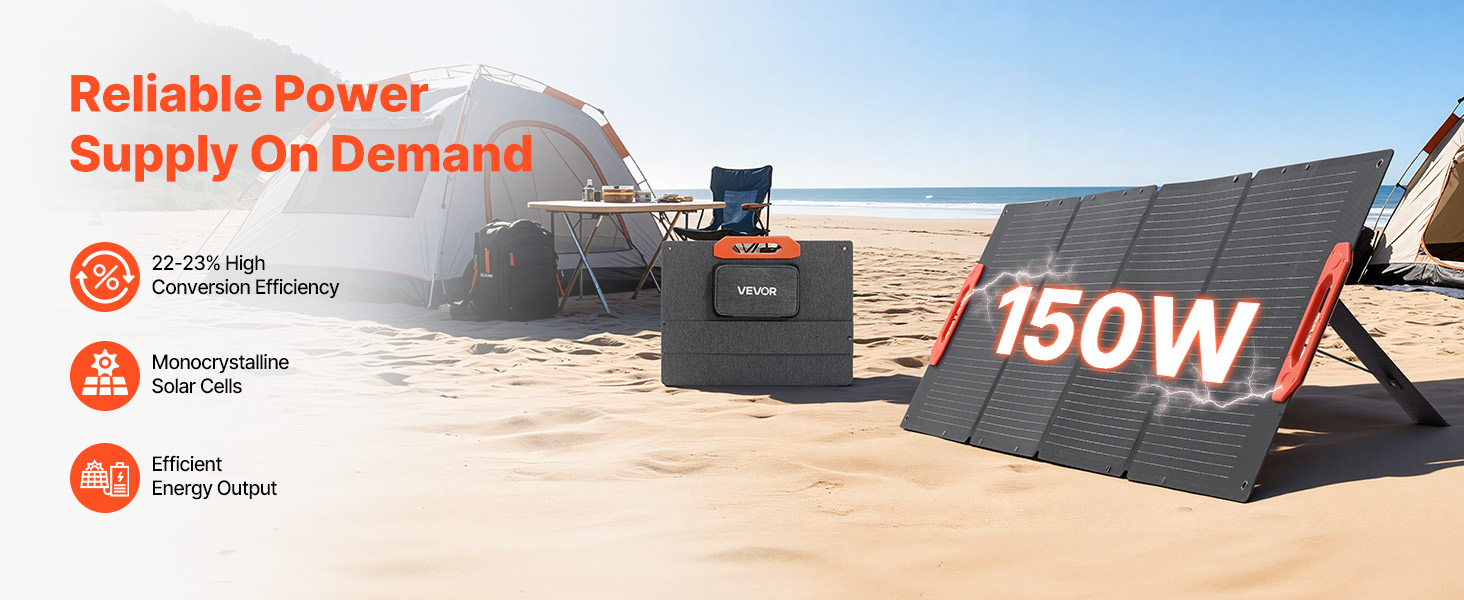 Napájajte svoje outdoorové dobrodružstvá pomocou nášho 150W prenosného skladacieho mono solárneho panelu. Je vyrobený z vysokoúčinných monokryštalických článkov a má 22-23% účinnosť konverzie, takže poskytuje spoľahlivý zdroj energie na rýchle nabíjanie zariadení - je to nevyhnutný spoločník na kempovanie, výlety s karavanom, turistiku a rybárčenie.