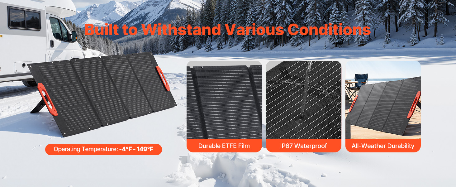 Táto nabíjačka solárnych panelov, skonštruovaná s vodotesnosťou IP67 a odolnou fóliou ETFE, spoľahlivo funguje pri teplotách od -20 °C do 65 °C (-4°F až 149°F), čím zabezpečuje stabilný a dlhotrvajúci výkon v rôznych vonkajších prostrediach.