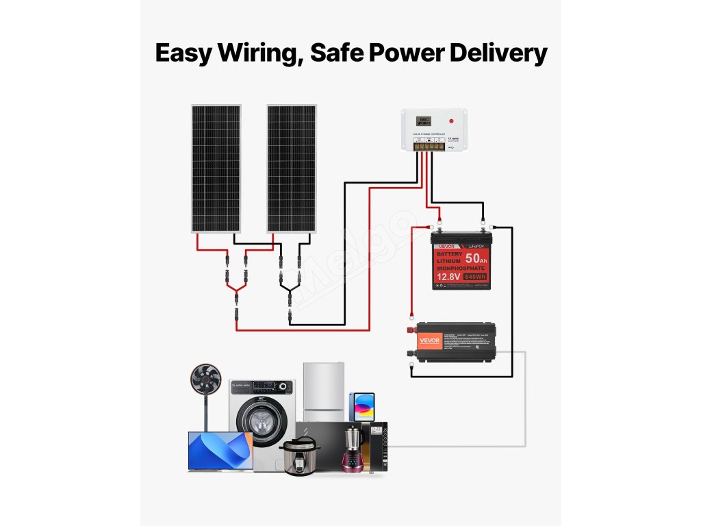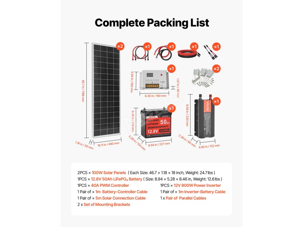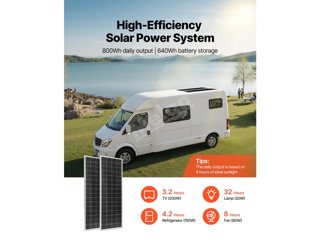 Táto kompletná súprava solárnej energie obsahuje 2 ks 100W monokryštalických solárnych panelov, 12,8V 50Ah LiFePO₄ batériu, 40A PWM regulátor solárneho nabíjania a 12V 800W striedač. S výkonom až 800Wh/deň a úložným priestorom 640Wh batérie poskytuje spoľahlivé napájanie pre obytné vozidlá, lode, domy, kempovanie a iné.
