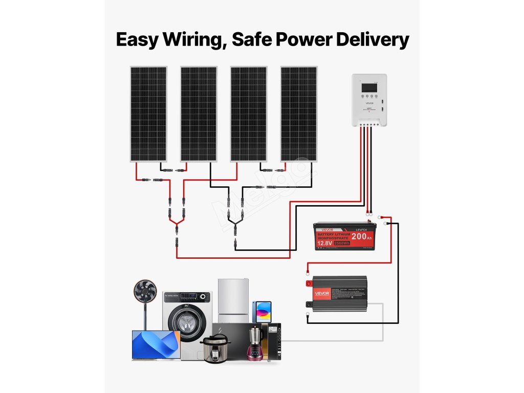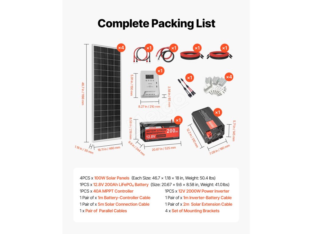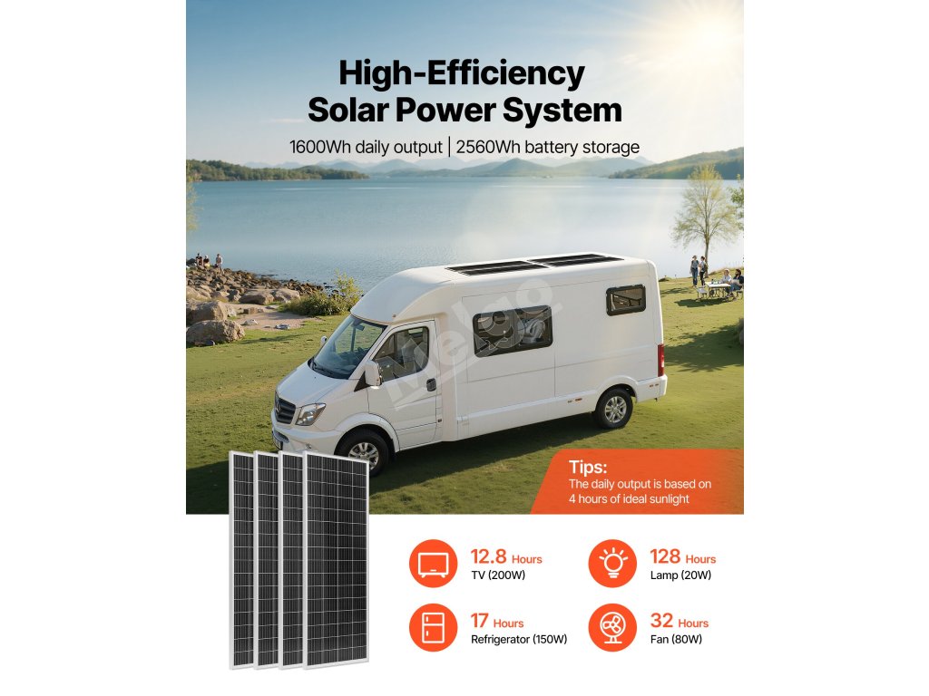 Táto súprava solárnej energie obsahuje 4 ks 100W monokryštalických solárnych panelov, 12,8V 200Ah LiFePO₄ batériu, 40A MPPT solárny regulátor nabíjania a 12V 2000W striedač. S výkonom až 1600Wh/deň a 2560Wh akumulátorom poskytuje spoľahlivé napájanie pre obytné vozidlá, lode, domy a ďalšie zariadenia.