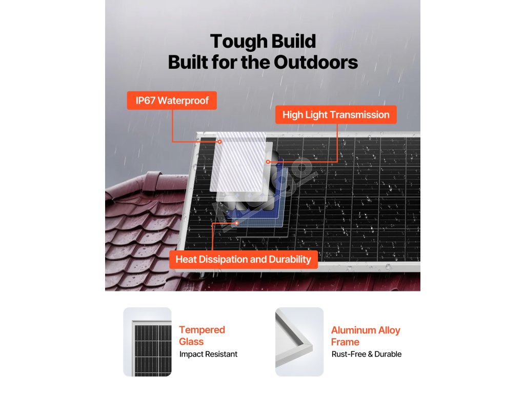 Monokryštalické solárne články s vysokou účinnosťou zabezpečujú vynikajúcu konverziu energie. Vďaka vodotesnosti IP67 sú spoľahlivé na dlhodobé používanie vo vonkajšom prostredí.