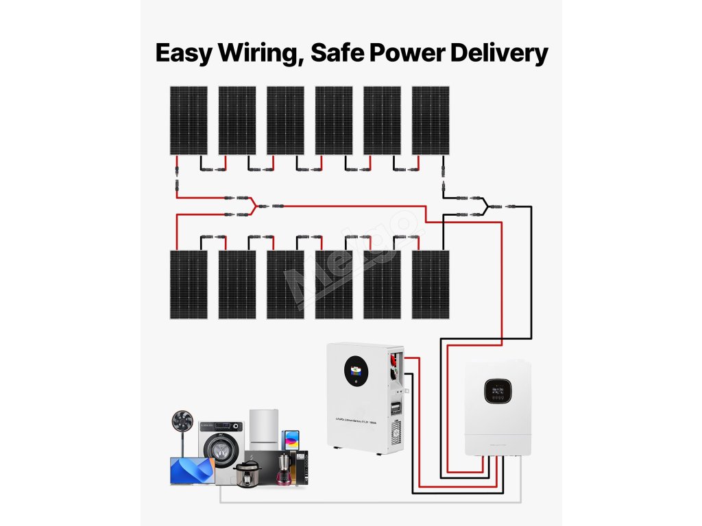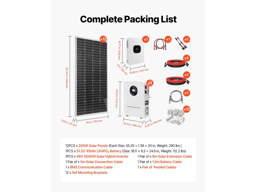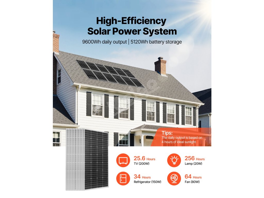 Táto súprava solárnej energie obsahuje 12 ks 200W solárnych panelov, 51,2V 100Ah LiFePO₄ batériu a 48V 5000W hybridný solárny menič. S výkonom až 9600Wh/deň a 5120Wh akumulátorom poskytuje vysoký výkon na efektívne napájanie veľkých domov, prístreškov, fariem a spotrebičov s vysokou spotrebou.