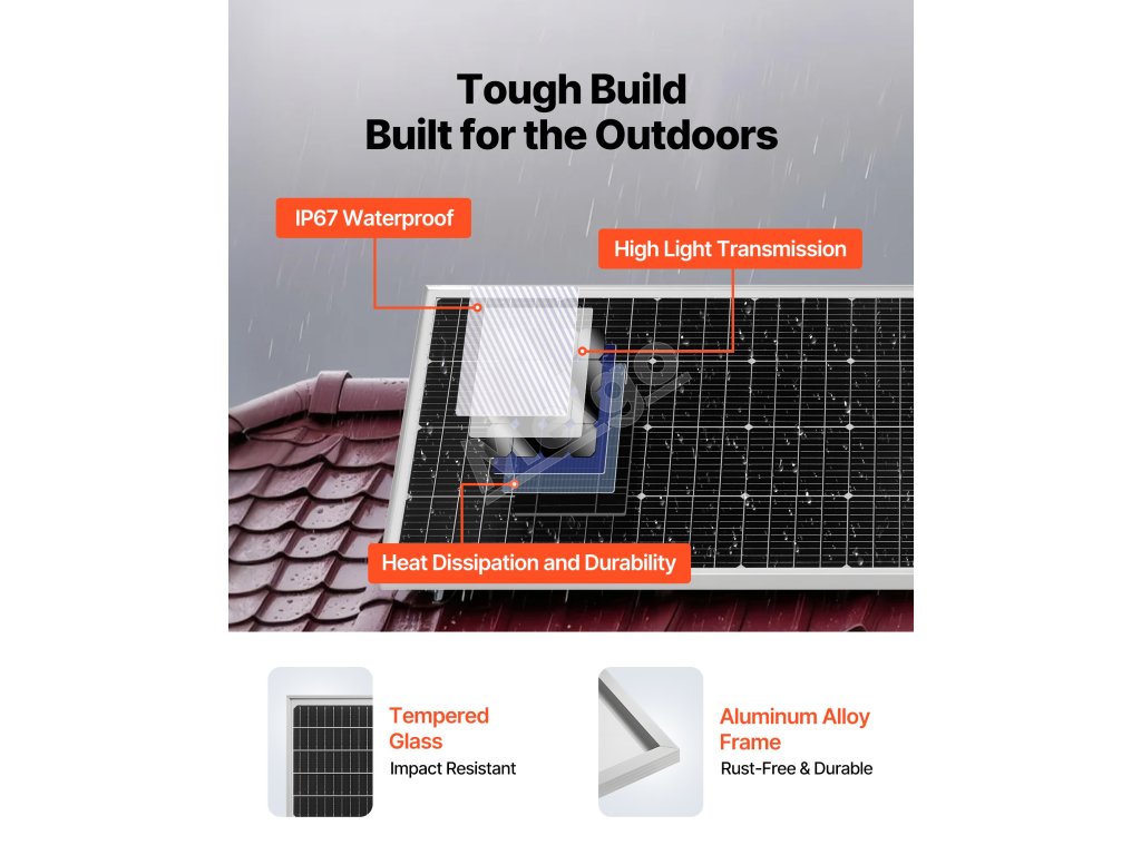 Monokryštalické solárne články s vysokou účinnosťou zabezpečujú vynikajúcu konverziu energie. Vďaka vodotesnosti IP67 sú spoľahlivé na dlhodobé používanie vo vonkajšom prostredí.