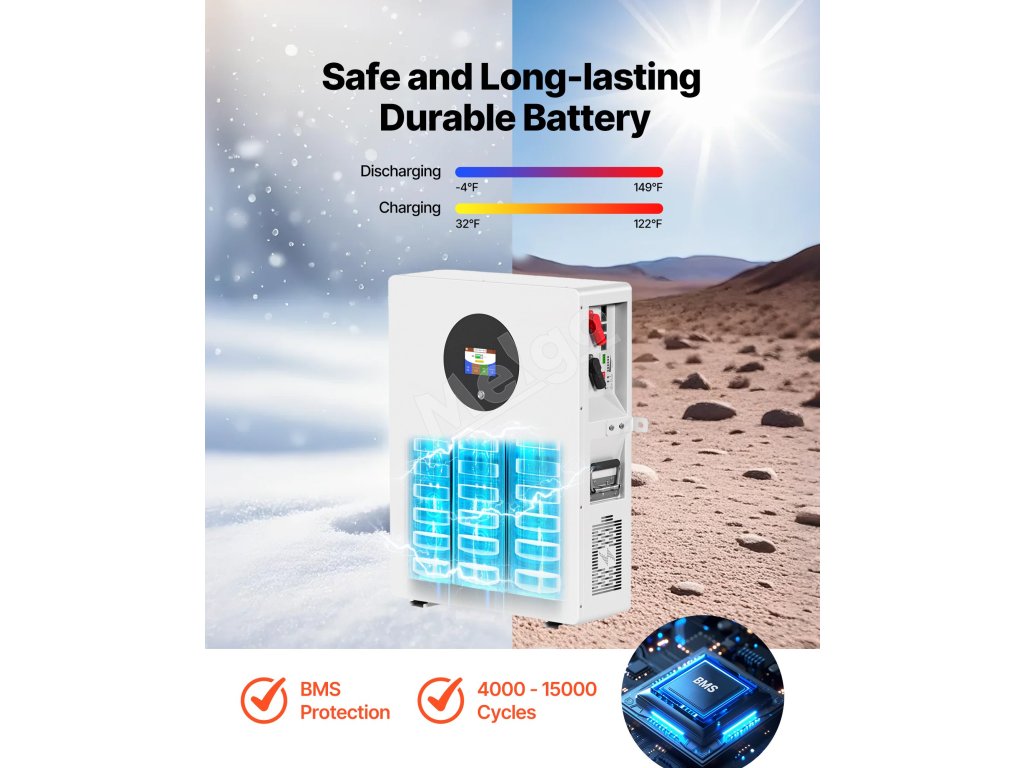 Vysokokvalitná batéria LiFePO₄ podporuje 4000-15 000 cyklov hlbokého nabitia. Zabudovaný systém BMS poskytuje inteligentnú ochranu a stabilný výstup, čím poskytuje trvalý výkon pre aplikácie mimo siete.