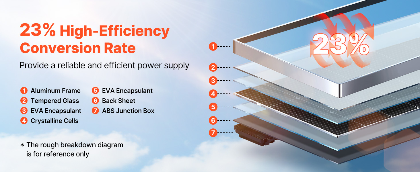 Monokryštalický solárny panel VEVOR 2ks * 100W poskytuje ≥23% účinnosť konverzie, stabilné pripojenie MC4, ochranu IP65 a hliníkový rám proti korózii. Spoľahlivo funguje v rôznych prostrediach a poskytuje stabilné napájanie pre autá, obytné vozidlá, lode, farmy, chaty a off-grid systémy.