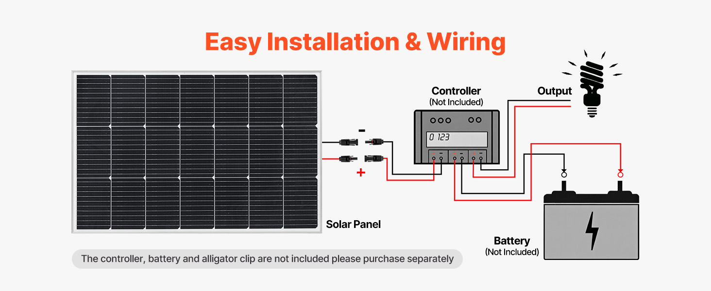 Tento solárny panel s monokryštalickým fotovoltickým modulom, ktorý je vybavený zabudovaným káblom MC4, ponúka bezpečné pripojenie k vášmu regulátoru a batérii pre stabilnú dodávku energie. (Regulátor, batéria a svorky nie sú súčasťou balenia.)