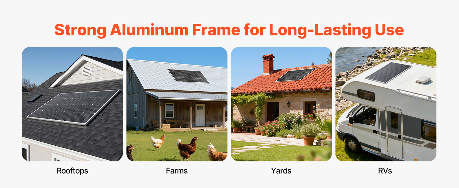 Tento solárny panel má odolný hliníkový rám, vďaka čomu je ideálny na dlhodobú inštaláciu na ploché strechy, strechy domov, farmy, dvory alebo obytné automobily, pričom poskytuje konzistentné a spoľahlivé napájanie. (Montážne konzoly NIE sú súčasťou balenia)