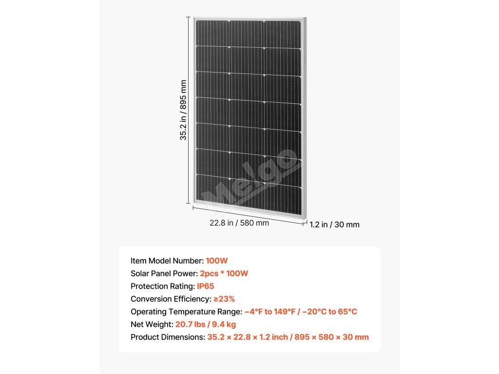 Monokryštalický solárny panel VEVOR 2ks * 100W poskytuje ≥23% účinnosť konverzie, stabilné pripojenie MC4, ochranu IP65 a hliníkový rám proti korózii. Spoľahlivo funguje v rôznych prostrediach a poskytuje stabilné napájanie pre autá, obytné vozidlá, lode, farmy, chaty a off-grid systémy.