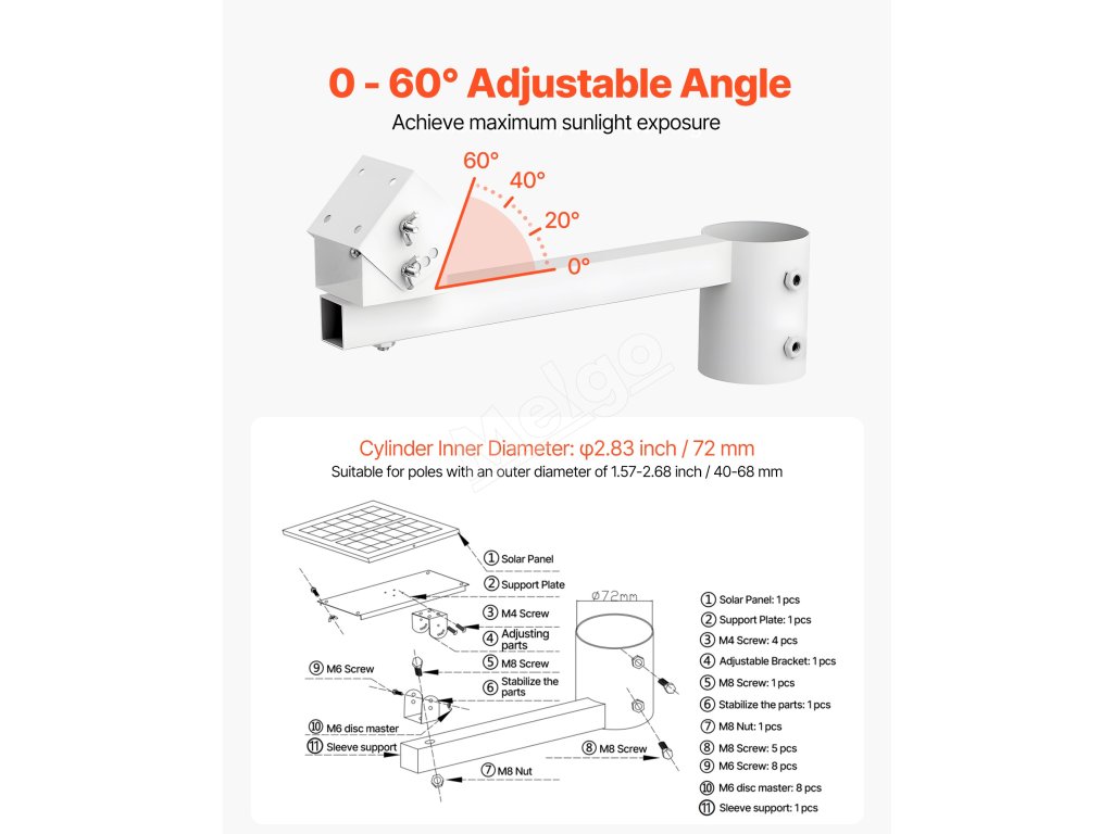 Táto súprava na nabíjanie batérií solárnych panelov sa dodáva s držiakom na stĺp, ktorý podporuje nastavenie uhla 0 - 60° a hodí sa na stĺpy s priemerom 1,57 - 2,68 palca / 40 - 68 mm. Ľahko sa inštaluje na brány, ploty, domy alebo trávniky.