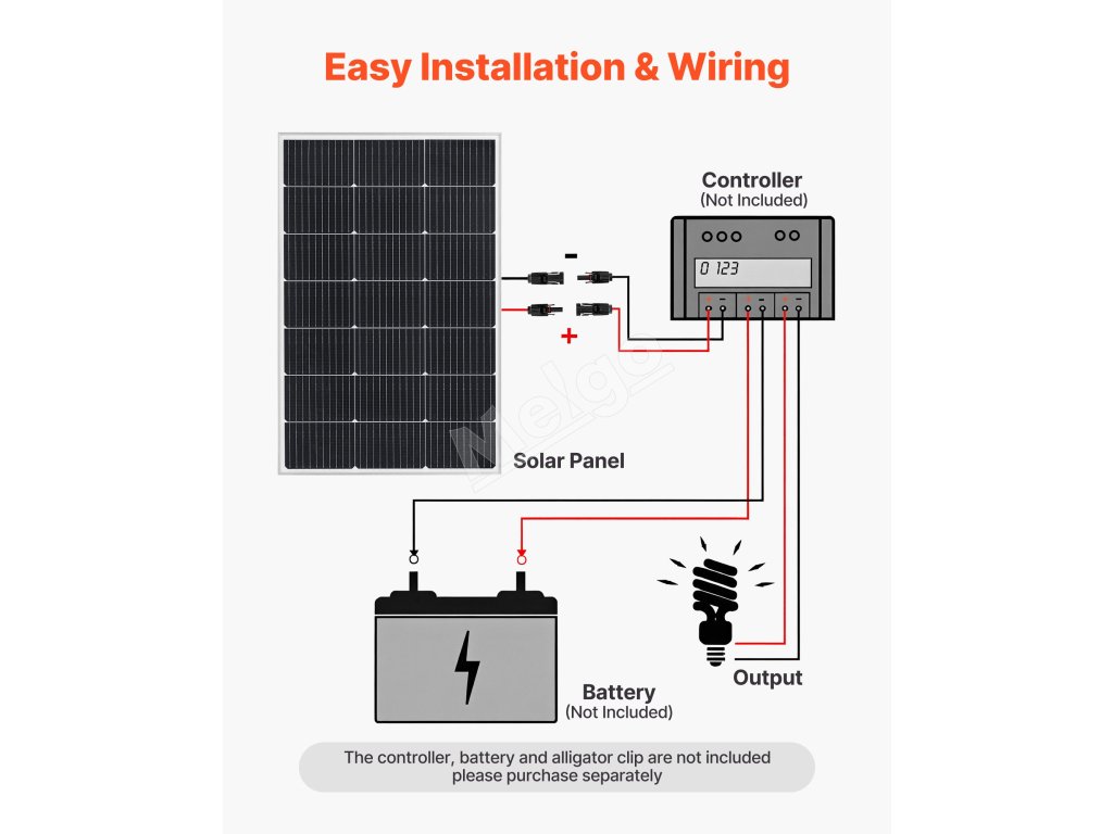 Tento solárny panel s monokryštalickým fotovoltickým modulom, ktorý je vybavený zabudovaným káblom MC4, ponúka bezpečné pripojenie k vášmu regulátoru a batérii pre stabilnú dodávku energie. (Regulátor, batéria a svorky nie sú súčasťou balenia.)