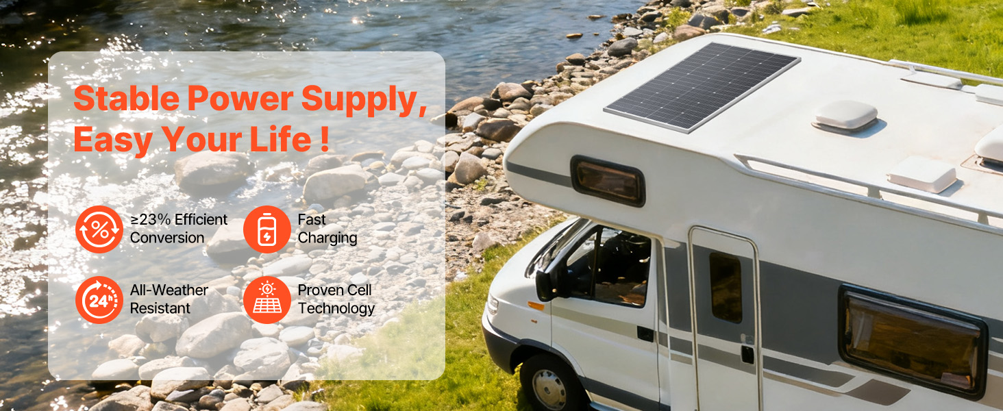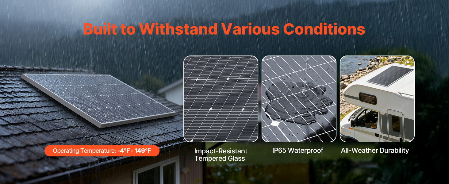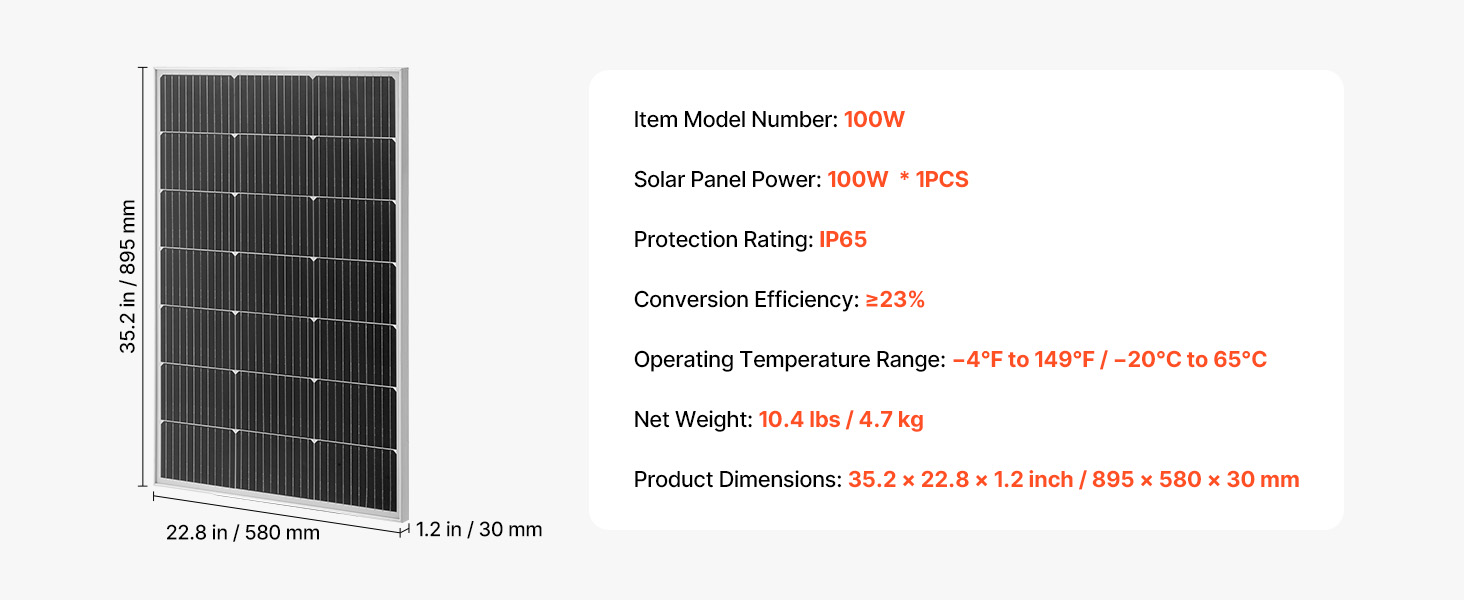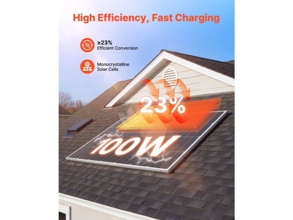 Tento 100W monokryštalický solárny panel VEVOR poskytuje ≥23% účinnosť konverzie, stabilné pripojenie MC4, ochranu IP65 a hliníkový rám proti korózii. Spoľahlivo funguje v rôznych prostrediach a poskytuje stabilné napájanie pre autá, obytné vozidlá, lode, farmy, chaty a off-grid systémy.