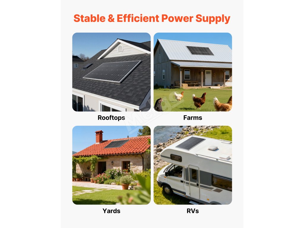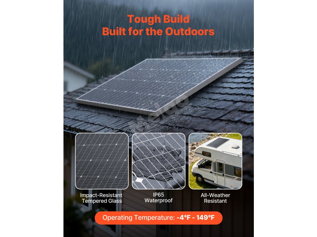 Tento solárny panel má odolný hliníkový rám, vďaka čomu je ideálny na dlhodobú inštaláciu na ploché strechy, strechy domov, farmy, dvory alebo obytné automobily, pričom poskytuje konzistentné a spoľahlivé napájanie. (Montážne konzoly NIE sú súčasťou balenia)