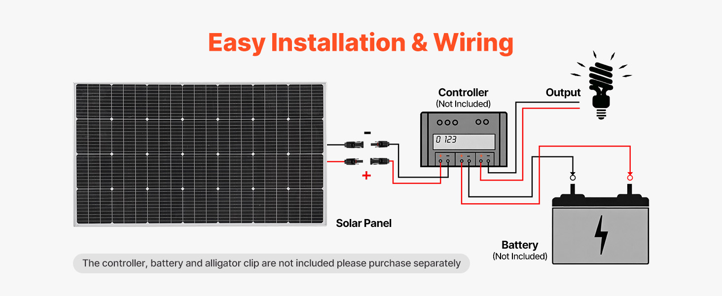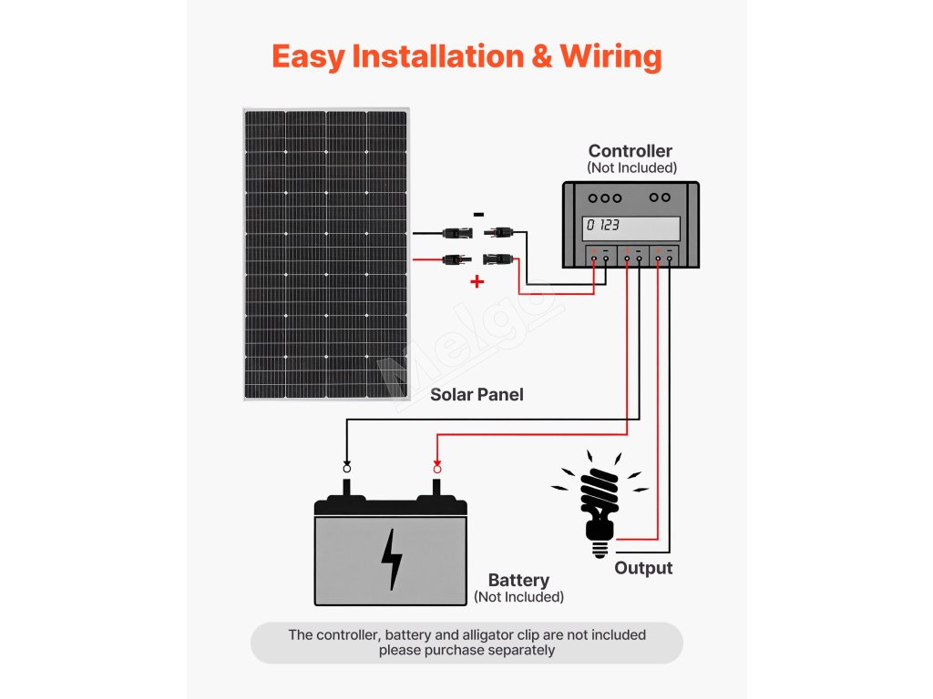 Tento solárny panel s monokryštalickým fotovoltickým modulom, ktorý je vybavený zabudovaným káblom MC4, ponúka bezpečné pripojenie k vášmu regulátoru a batérii pre stabilnú dodávku energie. (Regulátor, batéria a svorky nie sú súčasťou balenia.)