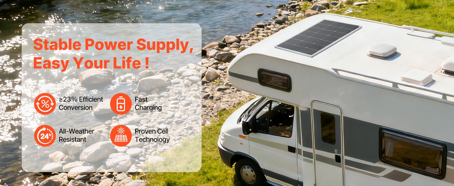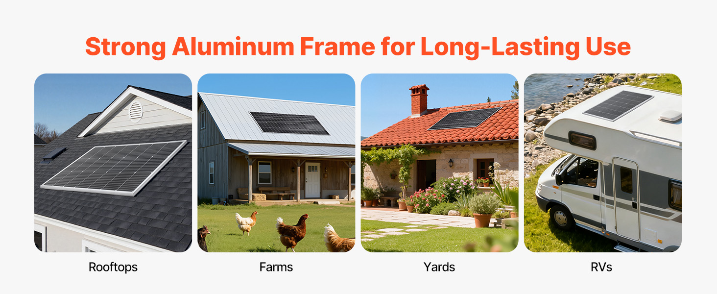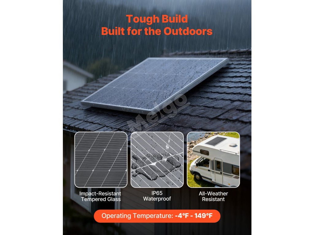 Tento solárny panel má odolný hliníkový rám, vďaka čomu je ideálny na dlhodobú inštaláciu na ploché strechy, strechy domov, farmy, dvory alebo obytné automobily, pričom poskytuje konzistentné a spoľahlivé napájanie. (Montážne konzoly NIE sú súčasťou balenia)