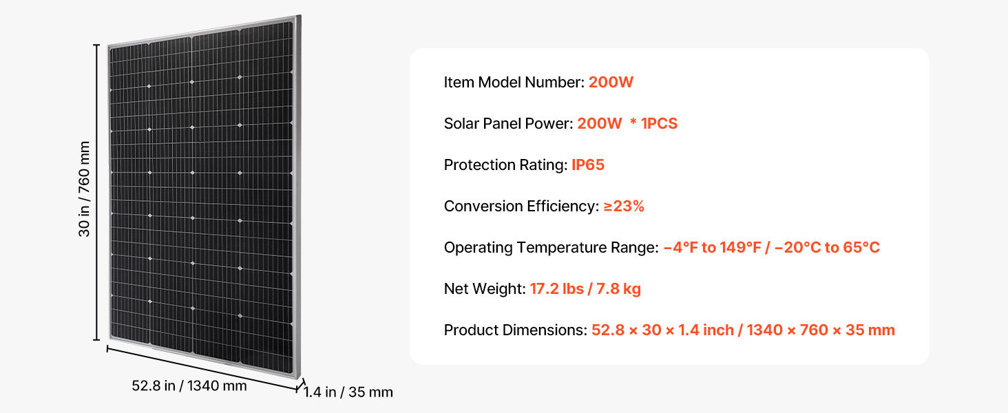 Tento monokryštalický solárny panel VEVOR s výkonom 200 W poskytuje účinnosť konverzie ≥ 23 %, stabilné pripojenie MC4, ochranu IP65 a hliníkový rám proti korózii. Spoľahlivo funguje v rôznych prostrediach a poskytuje stabilné napájanie pre autá, obytné vozidlá, lode, farmy, chaty a off-grid systémy.