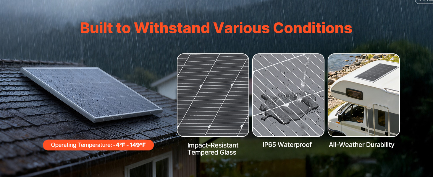 Tento solárny panel s krytím IP65 a odolným povrchom z tvrdeného skla spoľahlivo funguje v rozmedzí od -20 °C do 65 °C, čím zabezpečuje stabilný a dlhodobý výkon v rôznych vonkajších prostrediach.