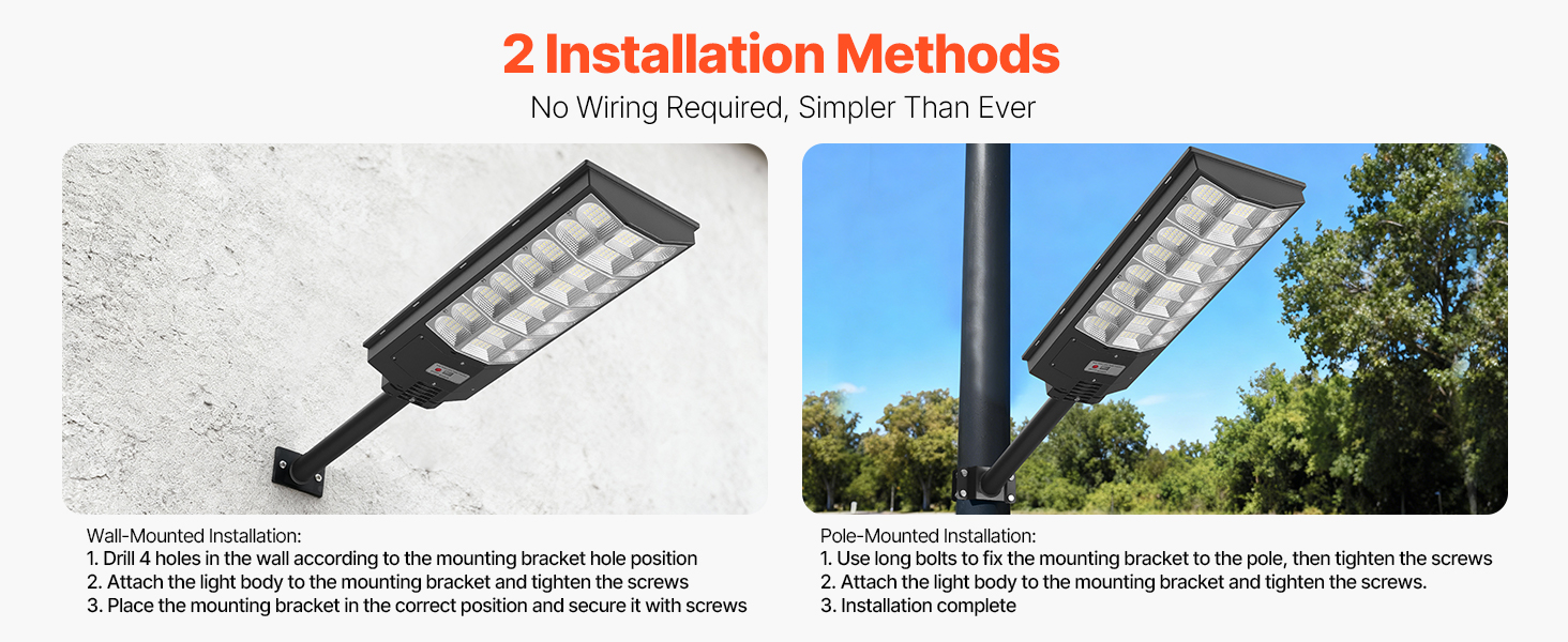 Toto solárne pouličné osvetlenie obsahuje všetko potrebné montážne príslušenstvo a je ľahko inštalovateľné. Nie je potrebné žiadne zapojenie ani vedenie. Stačí ho pripevniť skrutkami a hotovo.