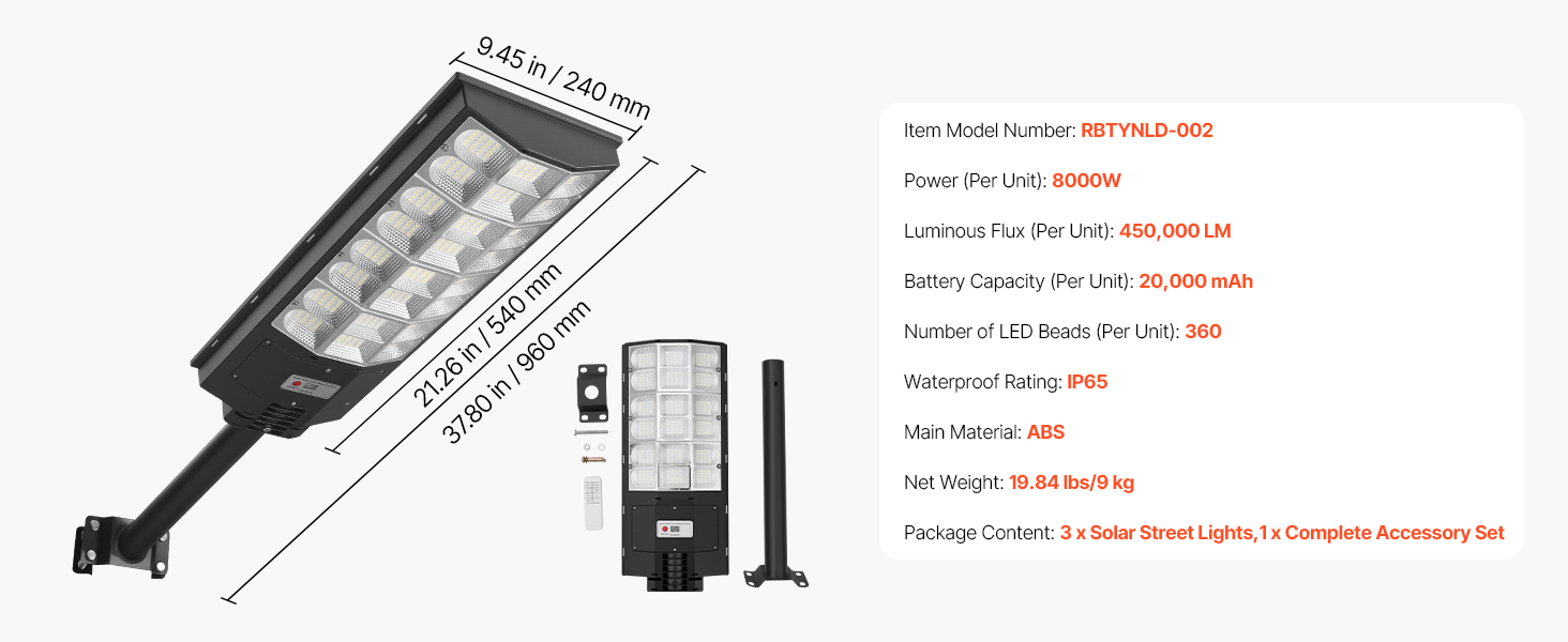Toto solárne pouličné osvetlenie pre vonkajšie použitie je vybavené 5730 vysoko svietivými, energeticky úspornými LED diódami a vyžaruje svetlo v uhle 240°. Dokáže osvetliť veľkú plochu dvora jasným svetlom bez blikania.
