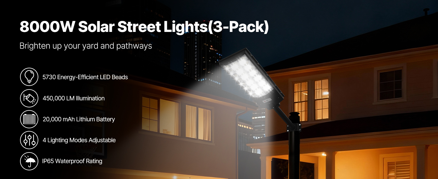 Solárne pouličné svietidlá 8000W, 450000LM, IP65, senzor pohybu, 3 ks
