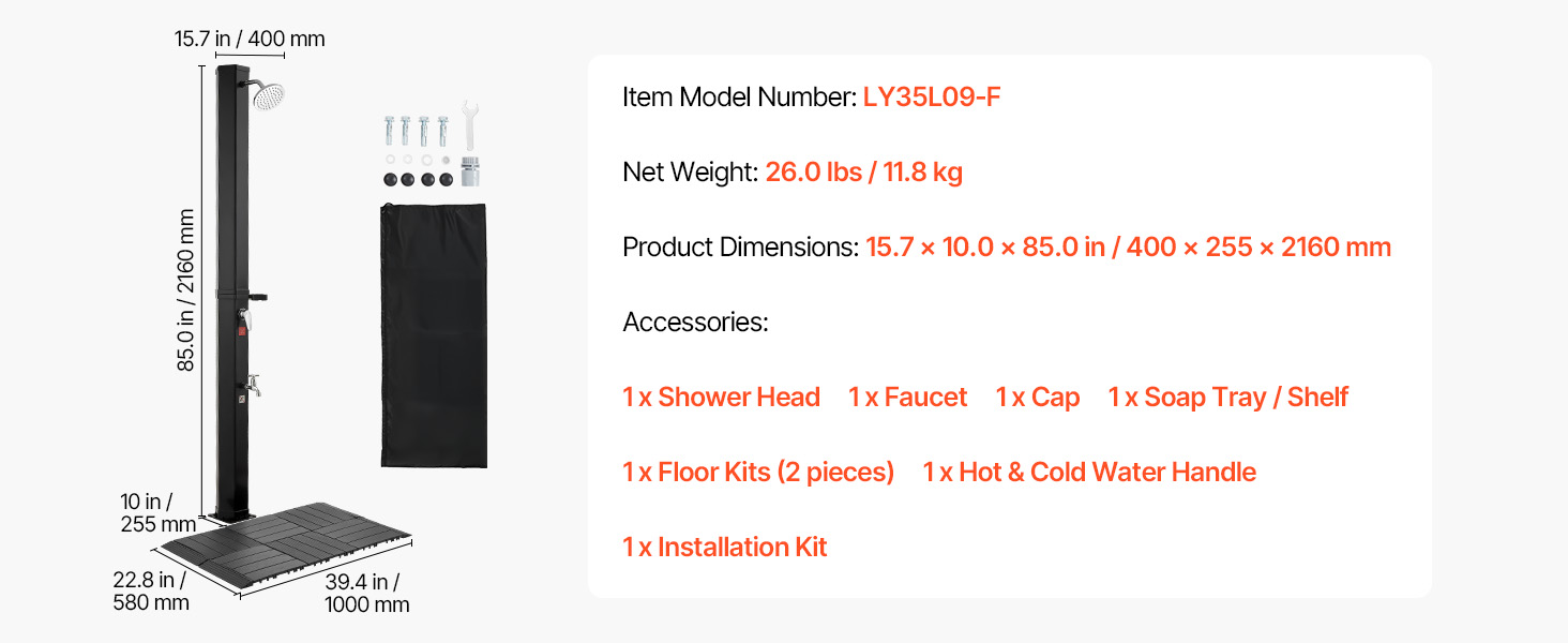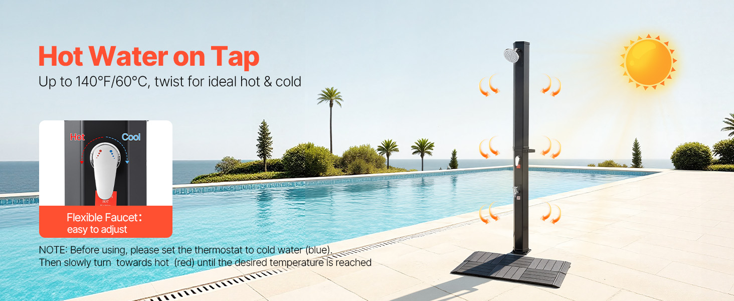 Zmiešajte teplú a studenú vodu, aby ste dosiahli preferované nastavenie. Súčasťou je odnímateľný ručný postrekovač a základňa na oplachovanie nôh. Voda sa môže pri silnom slnečnom svetle zohriať až na 60 °C / 140 °F.