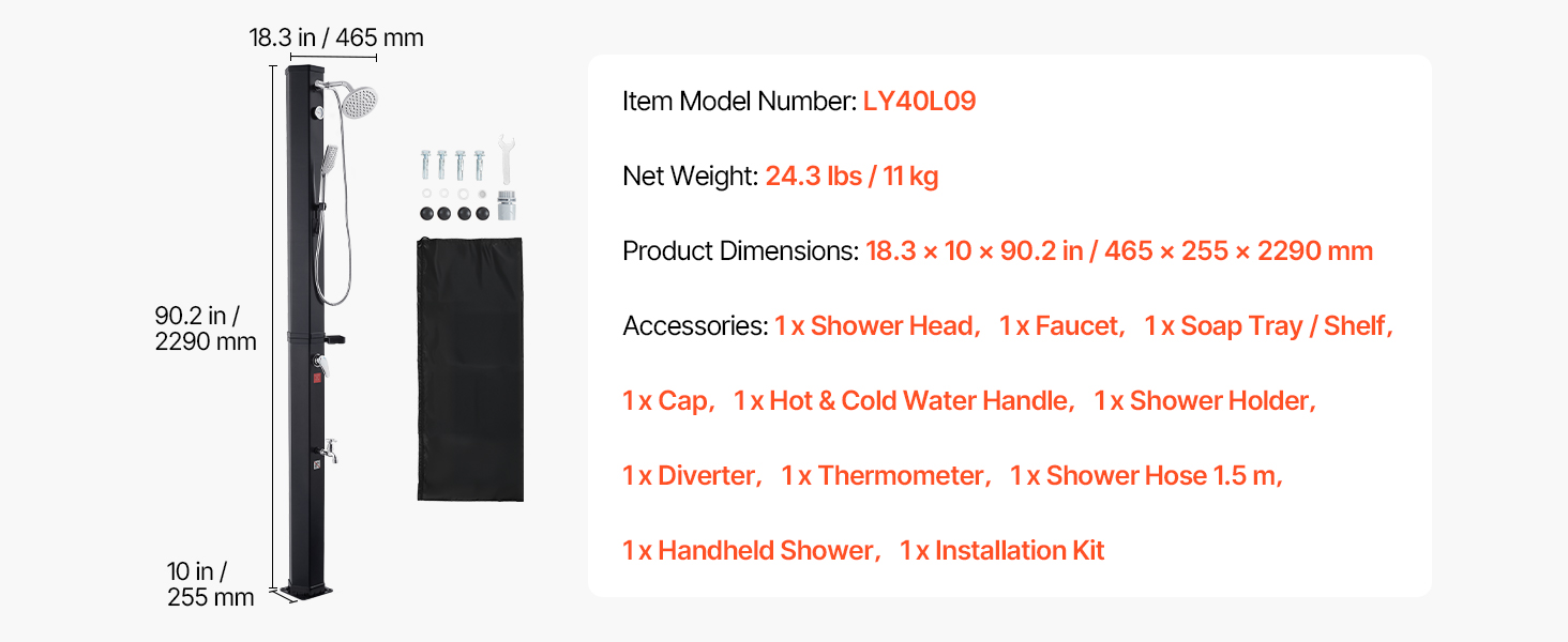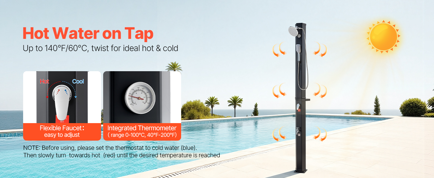 Zmiešajte teplú a studenú vodu, aby ste dosiahli preferované nastavenie. Obsahuje odnímateľný ručný rozprašovač a základňu na oplachovanie nôh. Voda sa môže pri silnom slnečnom žiarení zahriať až na 60 °C / 140 °F.