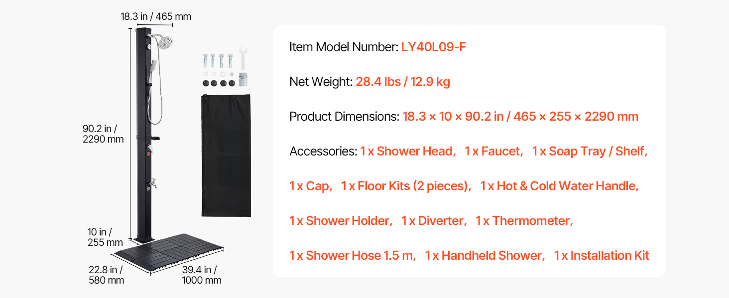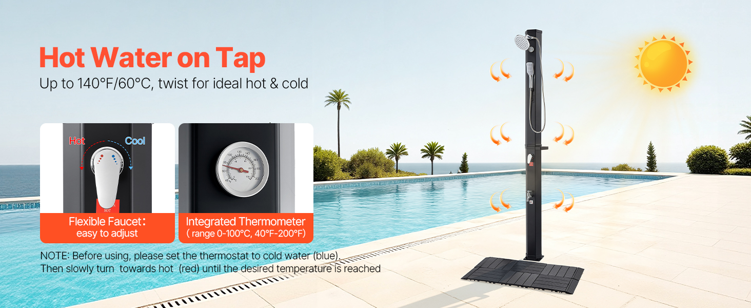 Zmiešajte teplú a studenú vodu, aby ste dosiahli preferované nastavenie. Obsahuje odnímateľný ručný rozprašovač a základňu na oplachovanie nôh. Voda sa môže pri silnom slnečnom žiarení zahriať až na 60 °C / 140 °F.