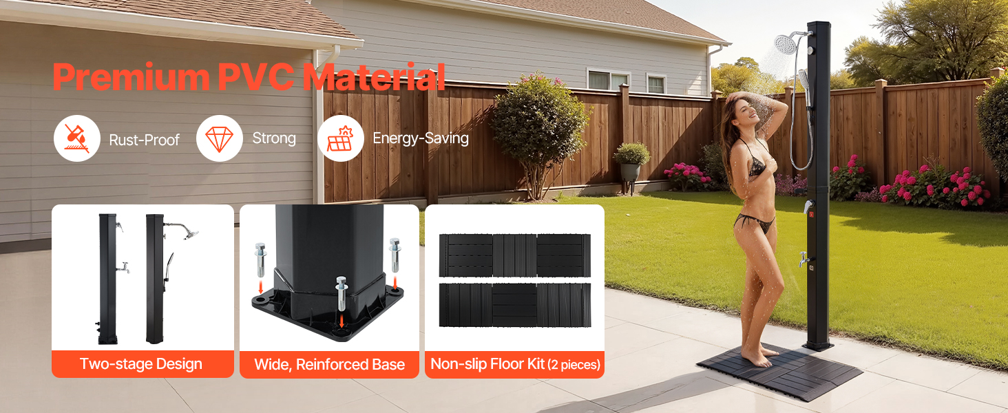 Solárne ohrievaná voda poskytuje konzistentný prietok na oplachovanie pred alebo po kúpaní. Ideálne na použitie v teplom počasí – nevhodné pre chladné ročné obdobia.