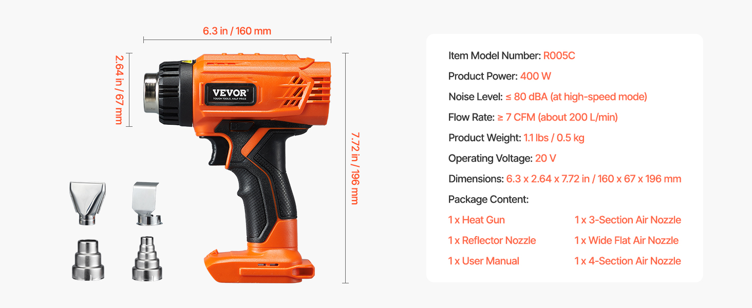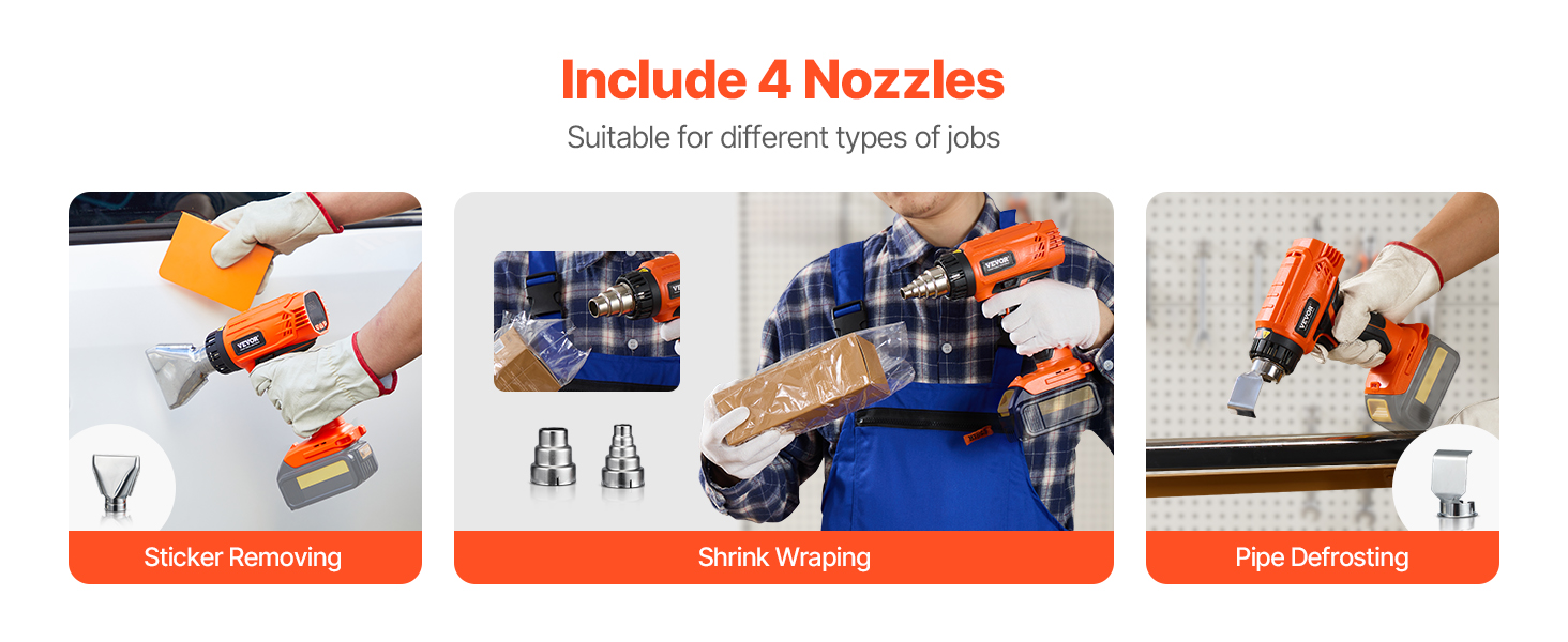 Táto multifunkčná prenosná teplovzdušná pištoľ obsahuje 4 trysky pre rôzne potreby, od zmršťovania, balenia vinylu až po odstraňovanie farby. Teplovzdušná zmršťovacia pištoľ je ideálna pre profesionálov aj domácich majstrov a je spoľahlivým spoločníkom pri domácich, štúdiových a vonkajších projektoch.