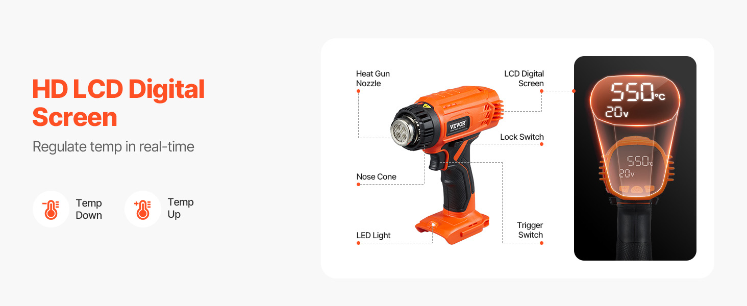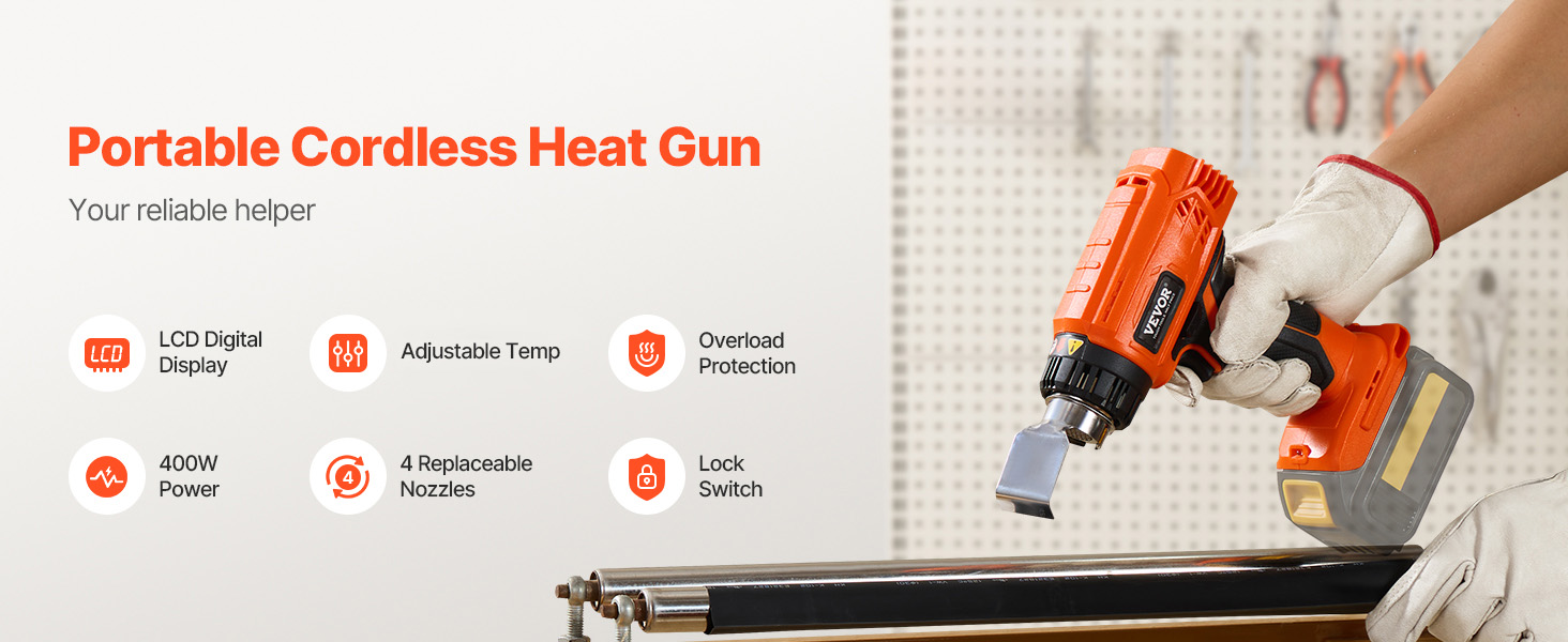 Táto bezdrôtová teplovzdušná pištoľ je vybavená výkonným motorom na rýchle zahrievanie. Zabudovaná funkcia ochrany proti nízkemu napätiu zabraňuje prehriatiu, čím zabezpečuje odolnosť a bezpečnosť. Spínač zámku vám uvoľní ruky, zatiaľ čo LED svetlo umožňuje jednoduchú obsluhu v tmavých a stiesnených priestoroch.