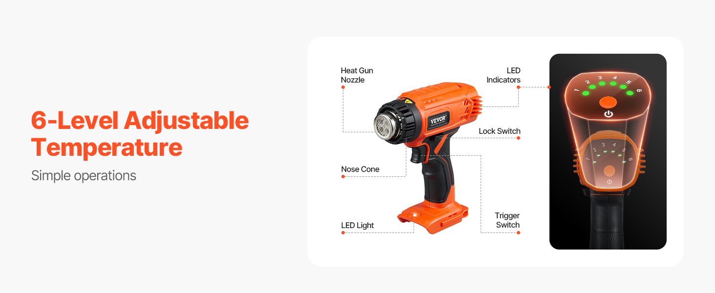Táto prenosná teplovzdušná pištoľ je vybavená LED indikátormi a 6 nastaveniami teploty, vďaka čomu môžete jednoducho nastaviť požadovanú teplotu pomocou jednoduchého tlačidlového ovládania a splniť tak rôzne požiadavky na prácu.