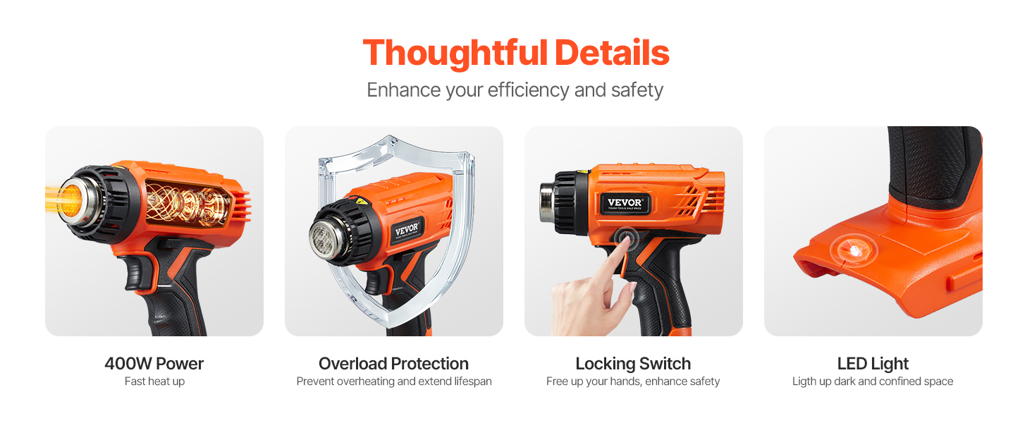 Táto bezdrôtová teplovzdušná pištoľ je vybavená výkonným motorom na rýchle zahrievanie. Zabudovaná funkcia ochrany proti nízkemu napätiu zabraňuje prehriatiu, čím zabezpečuje odolnosť a bezpečnosť. Spínač zámku vám uvoľní ruky, zatiaľ čo LED svetlo umožňuje jednoduchú obsluhu v tmavých a stiesnených priestoroch.