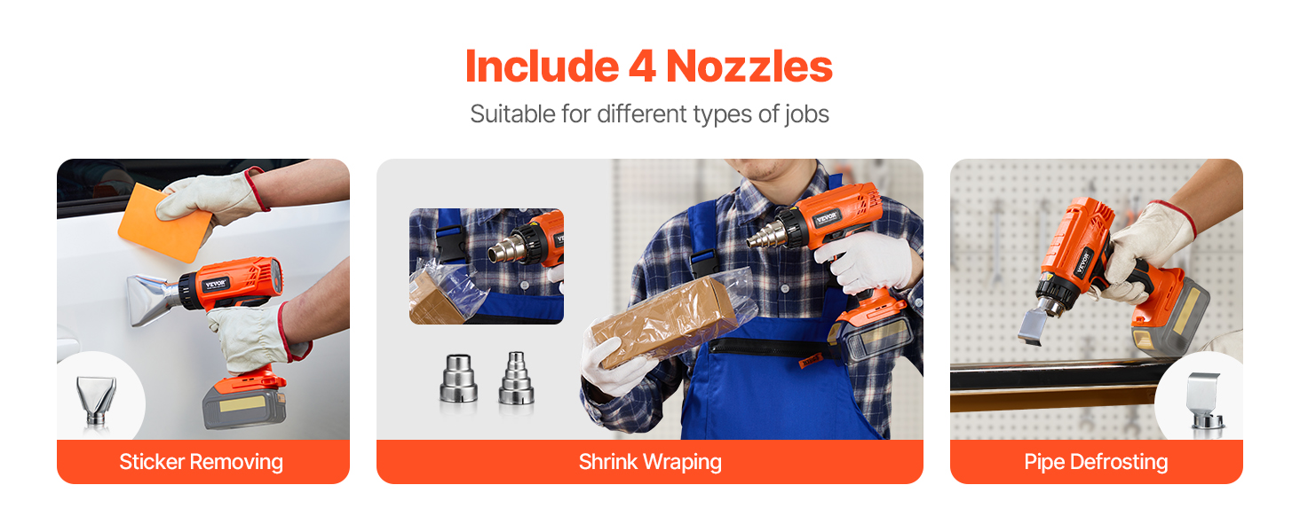 Táto multifunkčná prenosná teplovzdušná pištoľ obsahuje 4 trysky pre rôzne potreby, od zmršťovania, balenia vinylu až po odstraňovanie farby. Teplovzdušná zmršťovacia pištoľ je ideálna pre profesionálov aj domácich majstrov a je spoľahlivým spoločníkom pri domácich, štúdiových a vonkajších projektoch.