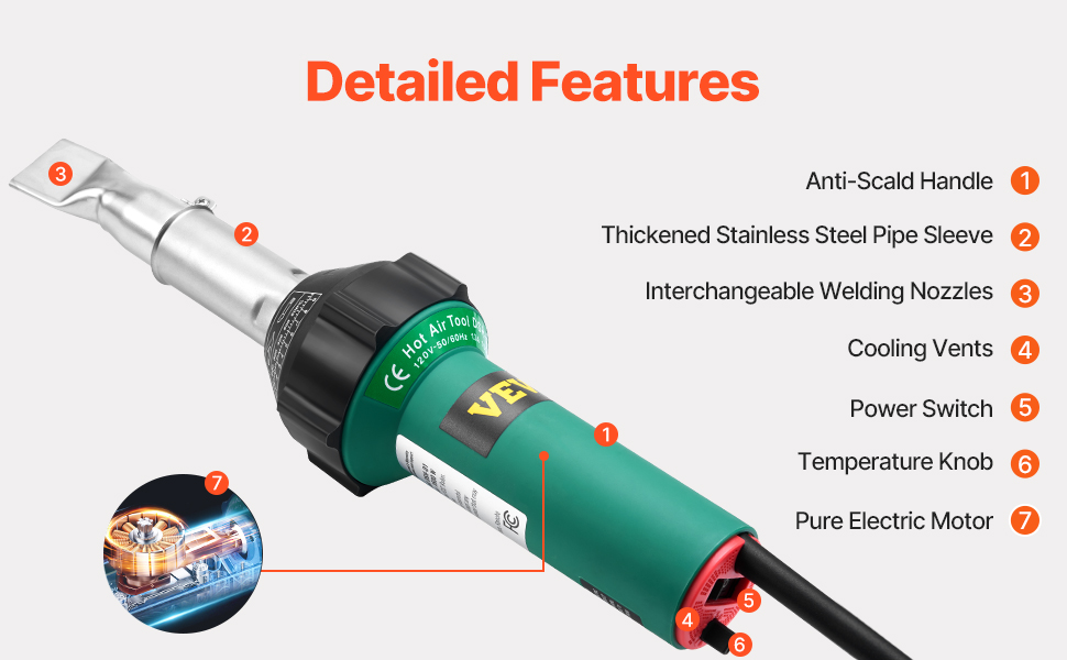 Horúcovzdušná zváračka plastov VEVOR je vybavená 1600W výkonným motorom z čistej medi, ktorý zabezpečuje rýchle zahrievanie na efektívne zváranie. Obsahuje sadu profesionálnej súpravy na zváranie plastov (s 9 kusmi príslušenstva). Vďaka 9-stupňovej regulácii teploty, účinnému chladeniu a dlhému napájaciemu káblu je ideálna pre začiatočníkov aj profesionálov.