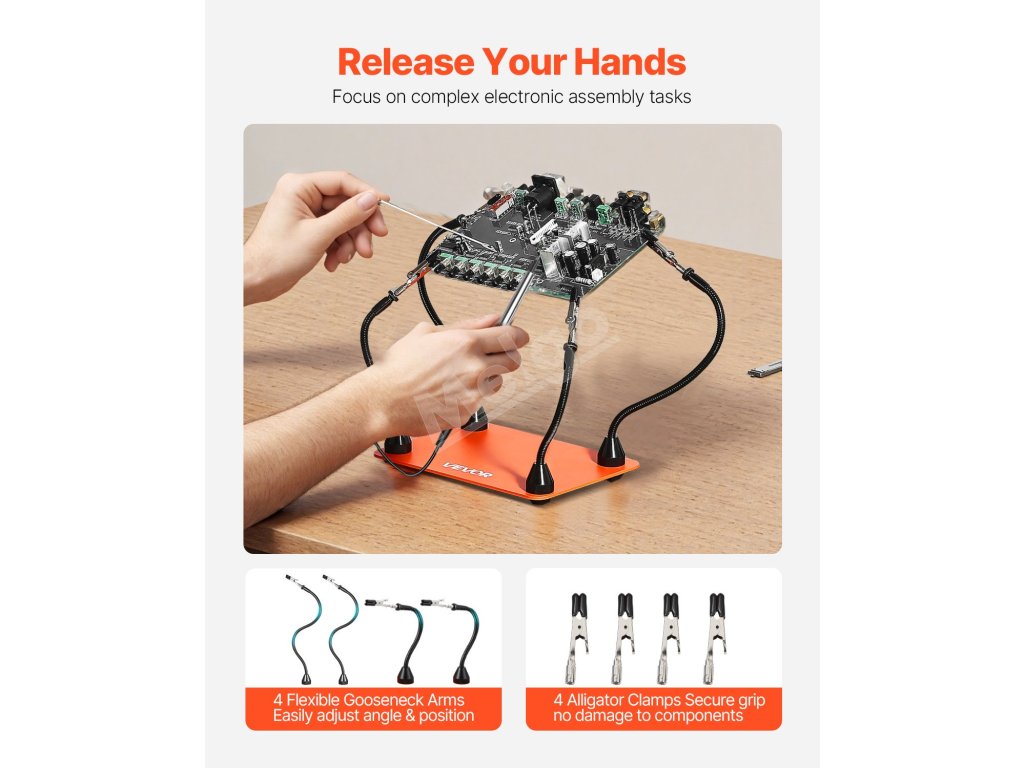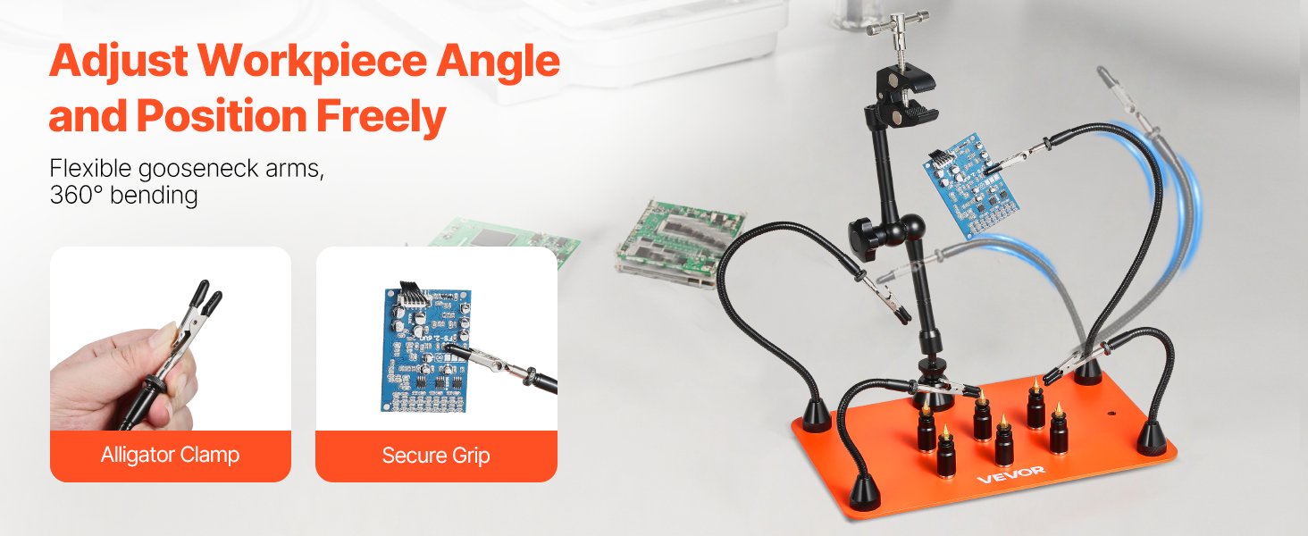 Naše pomocné ruky na spájkovanie majú 4 flexibilné ramená, ktoré sa dajú voľne ohýbať o 360°, čo umožňuje jednoduché nastavenie uhla a výšky na presné umiestnenie súčiastok. Sú ideálne na projekty akejkoľvek veľkosti, úplne uvoľnia vaše ruky a zefektívnia prácu.