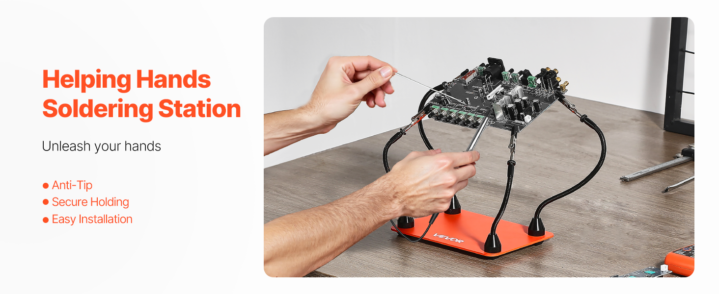 Táto spájkovacia stanica s pomocnými rukami je vhodná na širokú škálu úloh vrátane elektroniky, práce s plošnými spojmi, elektroinštalácie, vitráží, umeleckých remesiel a iných precíznych projektov.