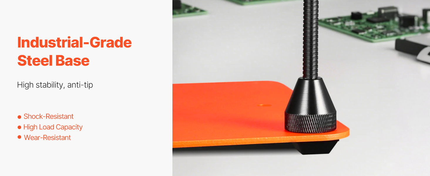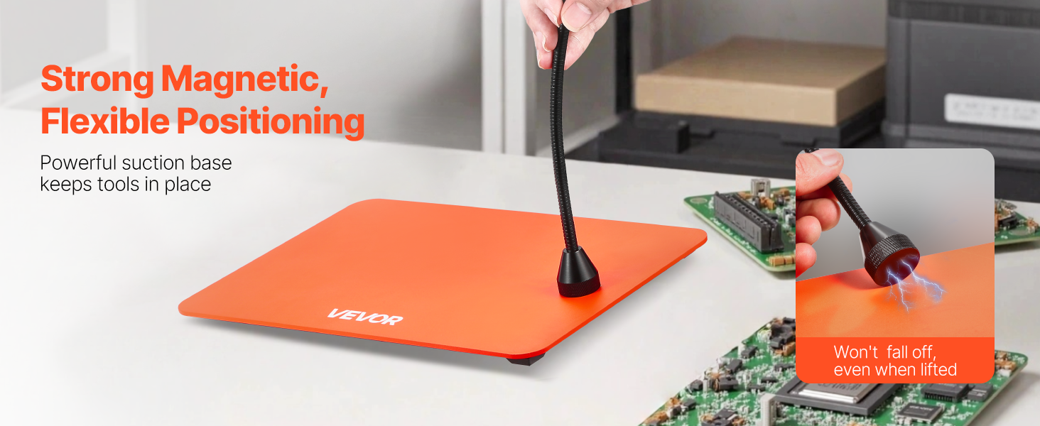 Základňa ramena s husím krkom je vybavená silnou magnetickou príťažlivosťou, vďaka ktorej sa bezpečne pripevní k pracovnej ploche. Toto náradie s pomocnými rukami teda zabraňuje posunu počas práce, znižuje riziko skĺznutia alebo prevrátenia náradia a umožňuje rýchle nastavenie, čím zvyšuje efektivitu práce.