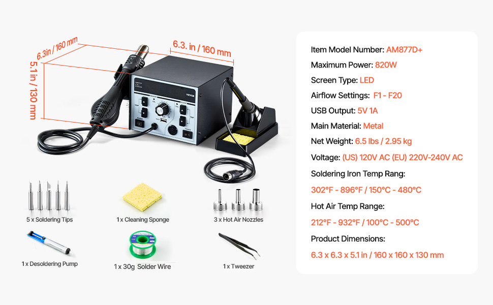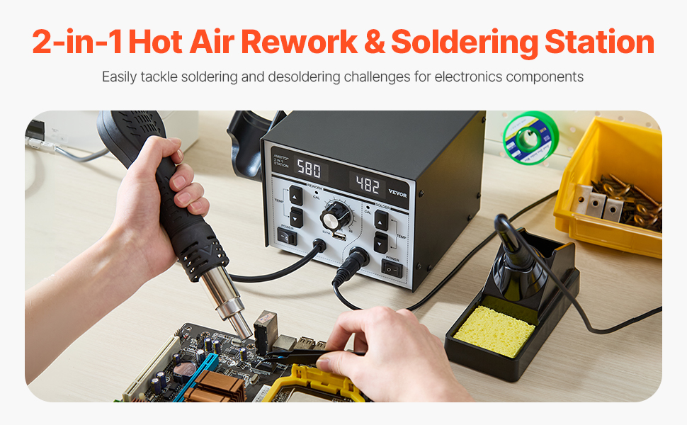 Premeňte svoju opravárenskú prácu s našou teplovzdušnou prepracovacou a spájkovacou stanicou 2 v 1. S maximálnym výkonom 820 W, teplotami horúceho vzduchu 212℉ až 932℉, teplotami spájkovania 302℉ až 896℉, 20-stupňovou reguláciou prietoku vzduchu, automatickým pohotovostným režimom a 5V USB portom je to vaše univerzálne riešenie na opravu elektroniky.
