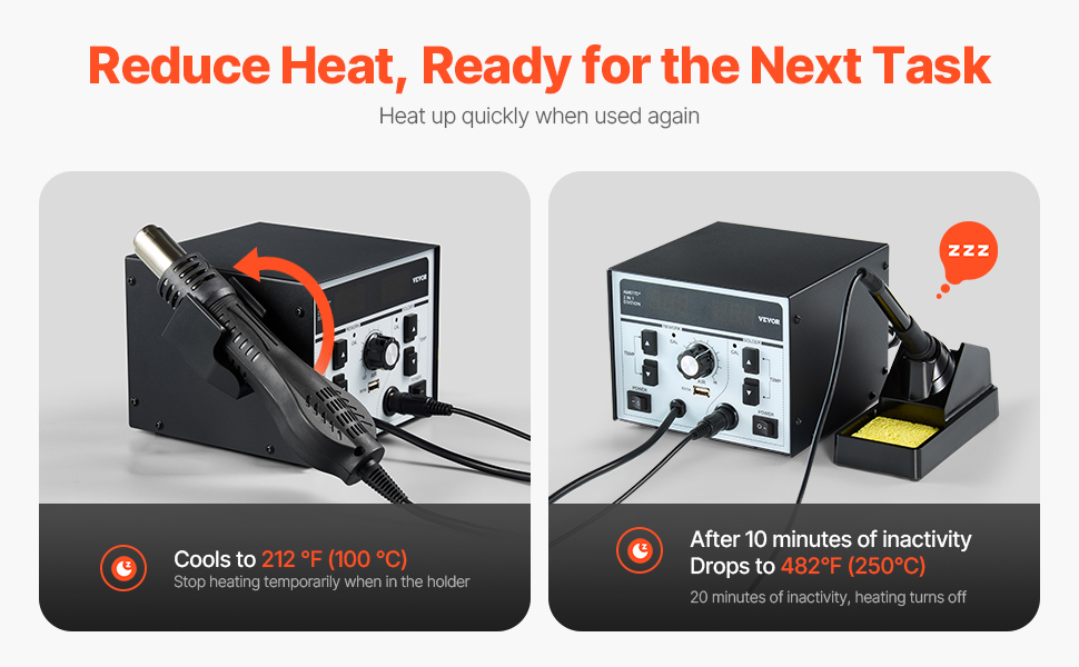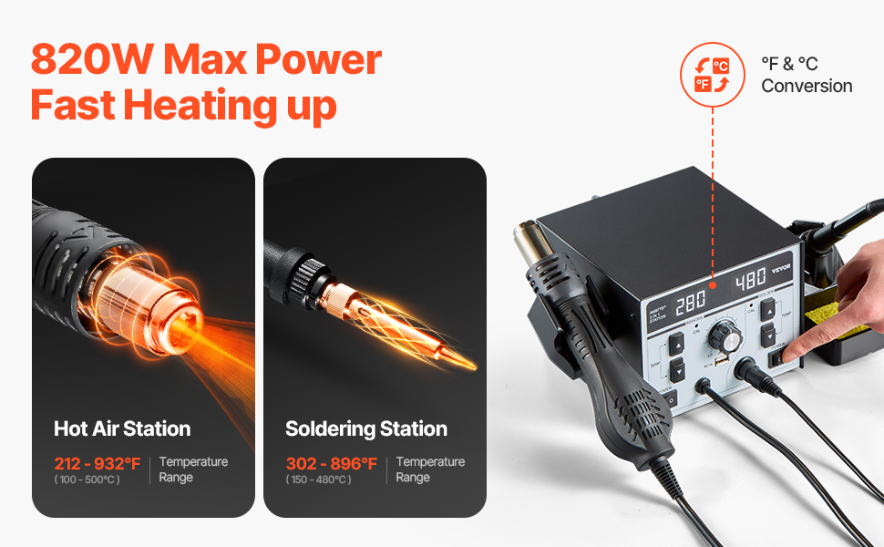 Vďaka maximálnemu výkonu 820 W sa táto súprava prepracovacej a spájkovacej stanice rýchlo zahrieva pre vaše potreby opravy elektroniky. Teplovzdušná stanica ponúka teplotný rozsah 212℉ - 932℉ (100 ℃ - 500 ℃), zatiaľ čo spájkovacia stanica dosahuje teploty od 302℉ - 896℉ (150 ℃ - 480 ℃).