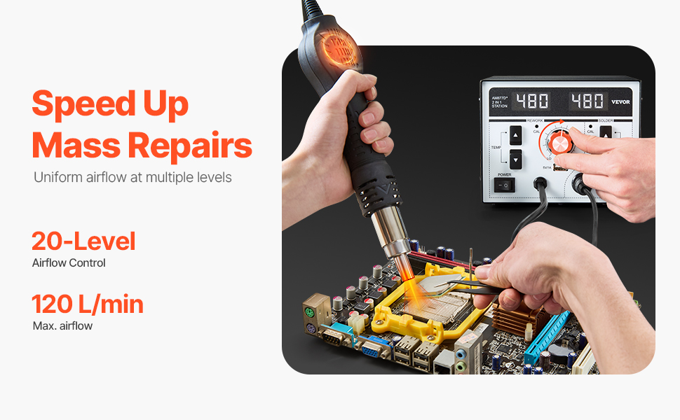 Získajte rýchlejšie a efektívnejšie opravy vďaka 20-stupňovému nastaviteľnému prietoku vzduchu (F1 až F20) a maximálnemu prietoku vzduchu 120 l/min. Táto funkcia poskytuje konzistentný prietok vzduchu na urýchlenie hromadných opráv, čím sa zvyšuje rýchlosť a presnosť opráv vašich elektronických komponentov.