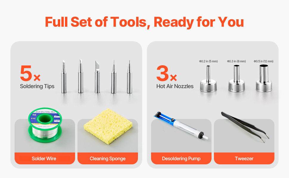 Táto kompletná súprava nástrojov obsahuje 5 x spájkovacie hroty, 3 x teplovzdušné trysky, 30 g bezolovnatého spájkovacieho drôtu, čistiacu hubku, odspájkovaciu pumpu, pinzetu a ďalšie nástroje, ktoré sú navrhnuté tak, aby zabezpečili efektívne dokončenie vašich prepracovaní a spájkovacích úloh.