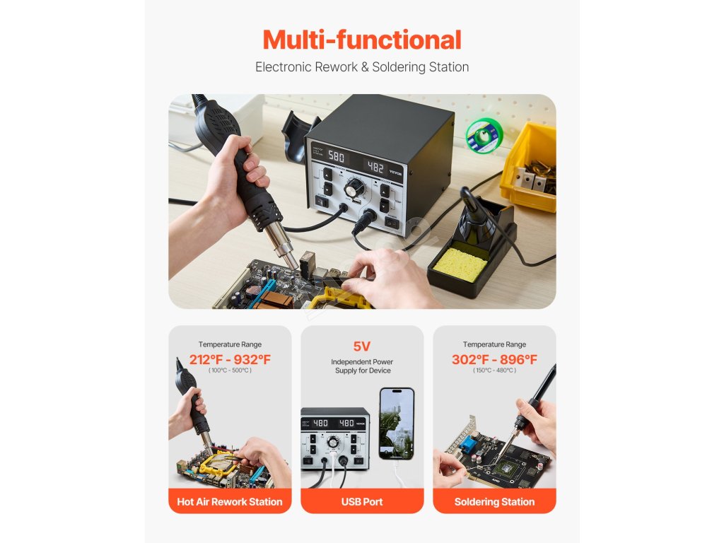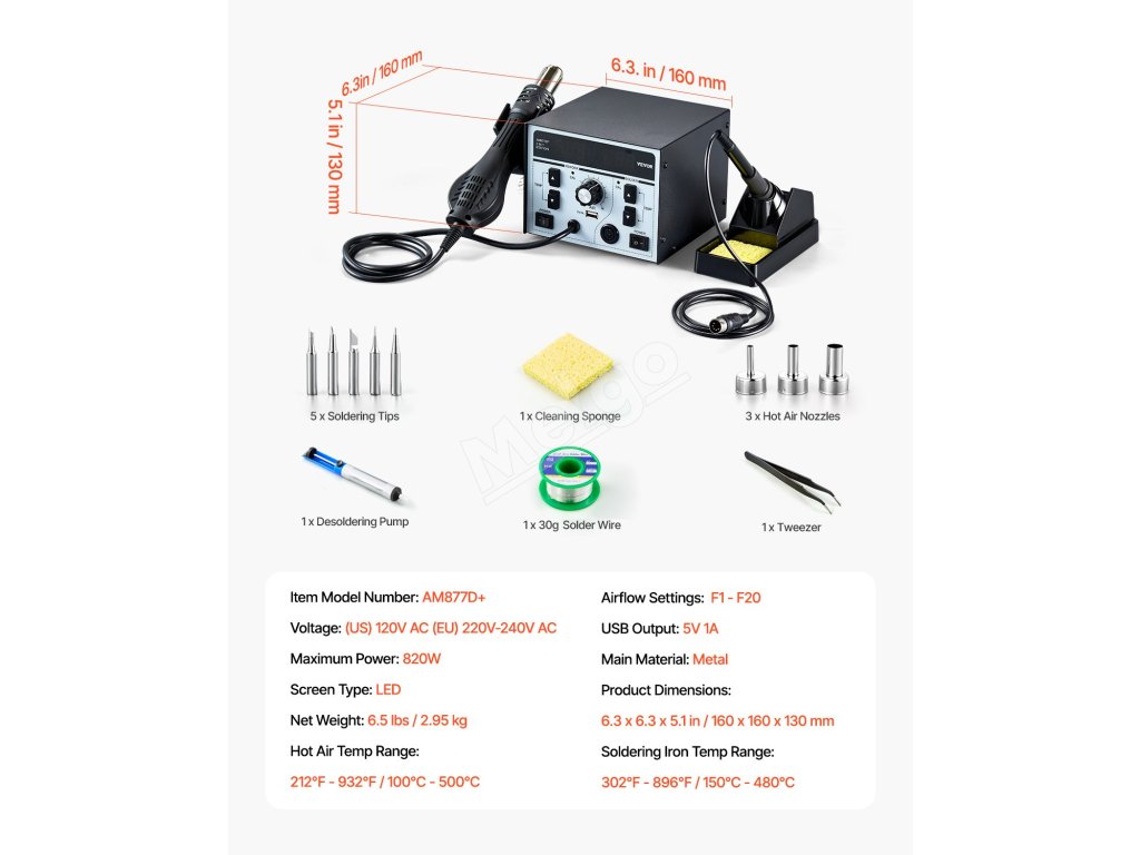 Premeňte svoju opravárenskú prácu s našou teplovzdušnou prepracovacou a spájkovacou stanicou 2 v 1. S maximálnym výkonom 820 W, teplotami horúceho vzduchu 212℉ až 932℉, teplotami spájkovania 302℉ až 896℉, 20-stupňovou reguláciou prietoku vzduchu, automatickým pohotovostným režimom a 5V USB portom je to vaše univerzálne riešenie na opravu elektroniky.