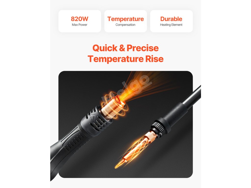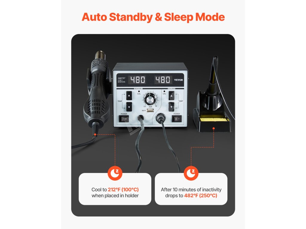 Vďaka maximálnemu výkonu 820 W sa táto súprava prepracovacej a spájkovacej stanice rýchlo zahrieva pre vaše potreby opravy elektroniky. Teplovzdušná stanica ponúka teplotný rozsah 212℉ - 932℉ (100 ℃ - 500 ℃), zatiaľ čo spájkovacia stanica dosahuje teploty od 302℉ - 896℉ (150 ℃ - 480 ℃).
