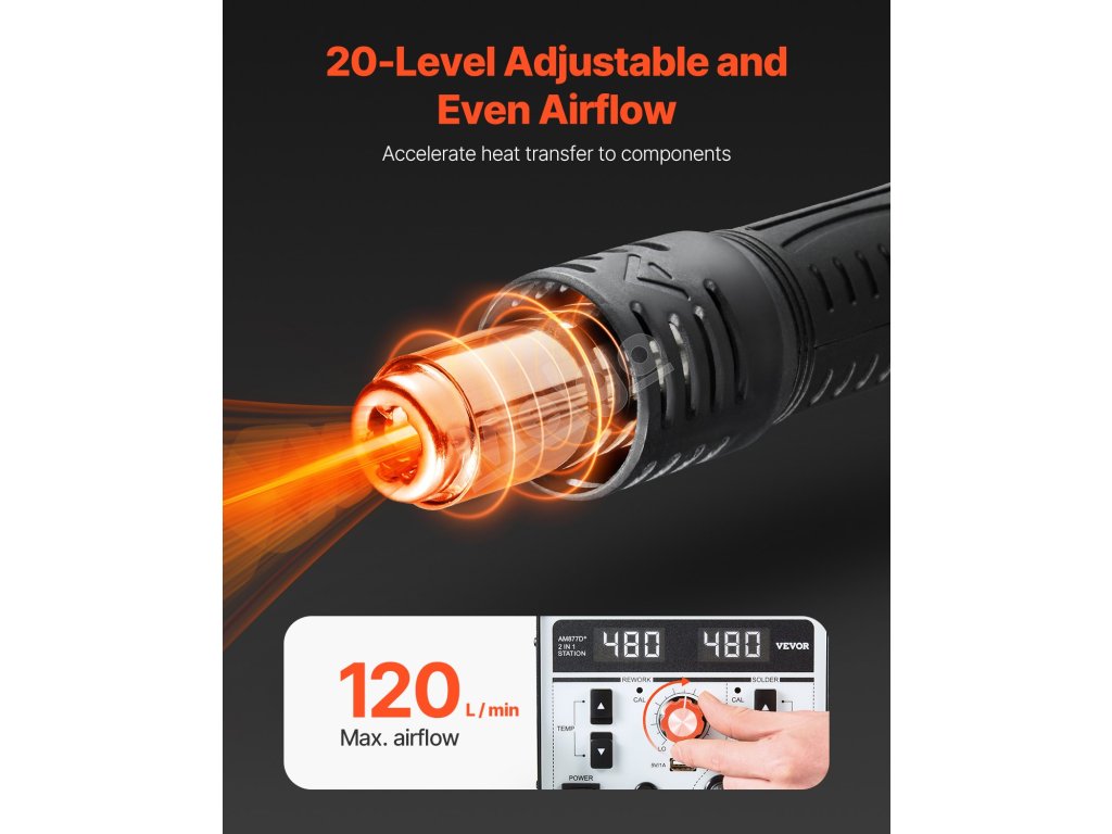 Získajte rýchlejšie a efektívnejšie opravy vďaka 20-stupňovému nastaviteľnému prietoku vzduchu (F1 až F20) a maximálnemu prietoku vzduchu 120 l/min. Táto funkcia poskytuje konzistentný prietok vzduchu na urýchlenie hromadných opráv, čím sa zvyšuje rýchlosť a presnosť opráv vašich elektronických komponentov.