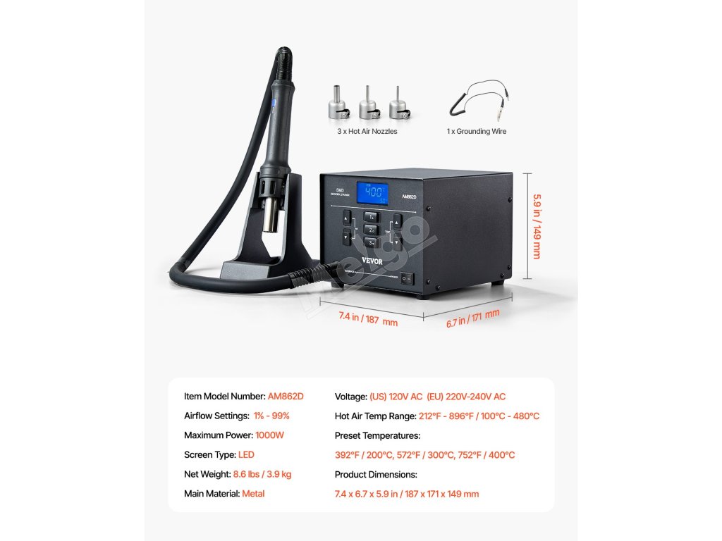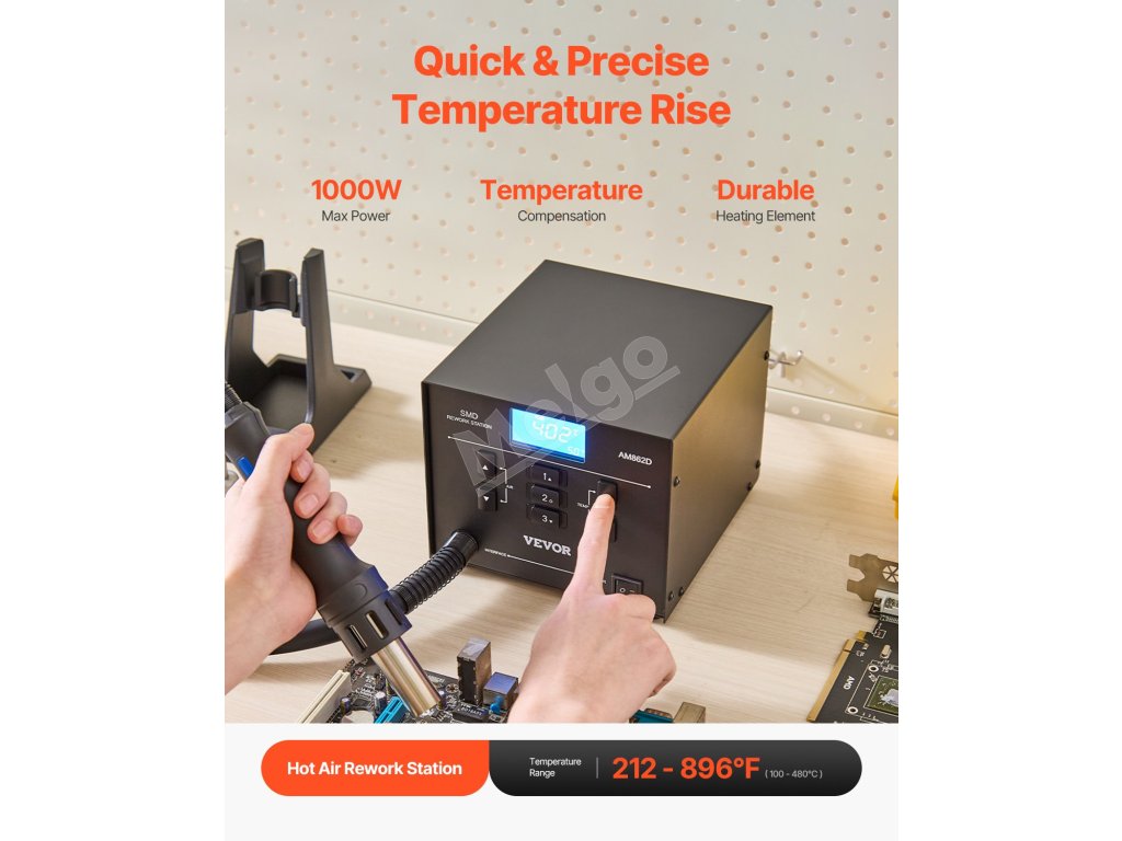 Táto prepracovacia stanica s digitálnym displejom a maximálnym výkonom 1000 W zabezpečuje rýchle zahrievanie, čo vám umožní pracovať efektívnejšie. Teplota sa pohybuje v rozmedzí 212℉ - 896℉ (100 ℃ - 480 ℃), čo vám poskytuje všestrannosť na precízne zvládnutie širokého spektra úloh.