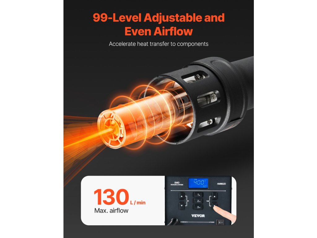 Získajte rýchlejšie a efektívnejšie opravy vďaka 99-stupňovému nastaveniu prietoku vzduchu (1 % - 99 %) a maximálnemu prietoku vzduchu 130 l/min. Táto funkcia poskytuje konzistentný prietok vzduchu na urýchlenie hromadných opráv, čím sa zvyšuje rýchlosť aj presnosť vašich elektronických komponentov.