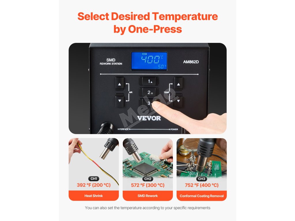 Vďaka 3 prednastaveným teplotám (200 ℃ / 300 ℃ / 400 ℃) umožňuje naša stanica na prepracovanie SMD jednoduchý prechod medzi preferovanými teplotami jedným stlačením. Teplotu si môžete tiež prispôsobiť tak, aby vyhovovala vašim špecifickým požiadavkám na rôzne úlohy.