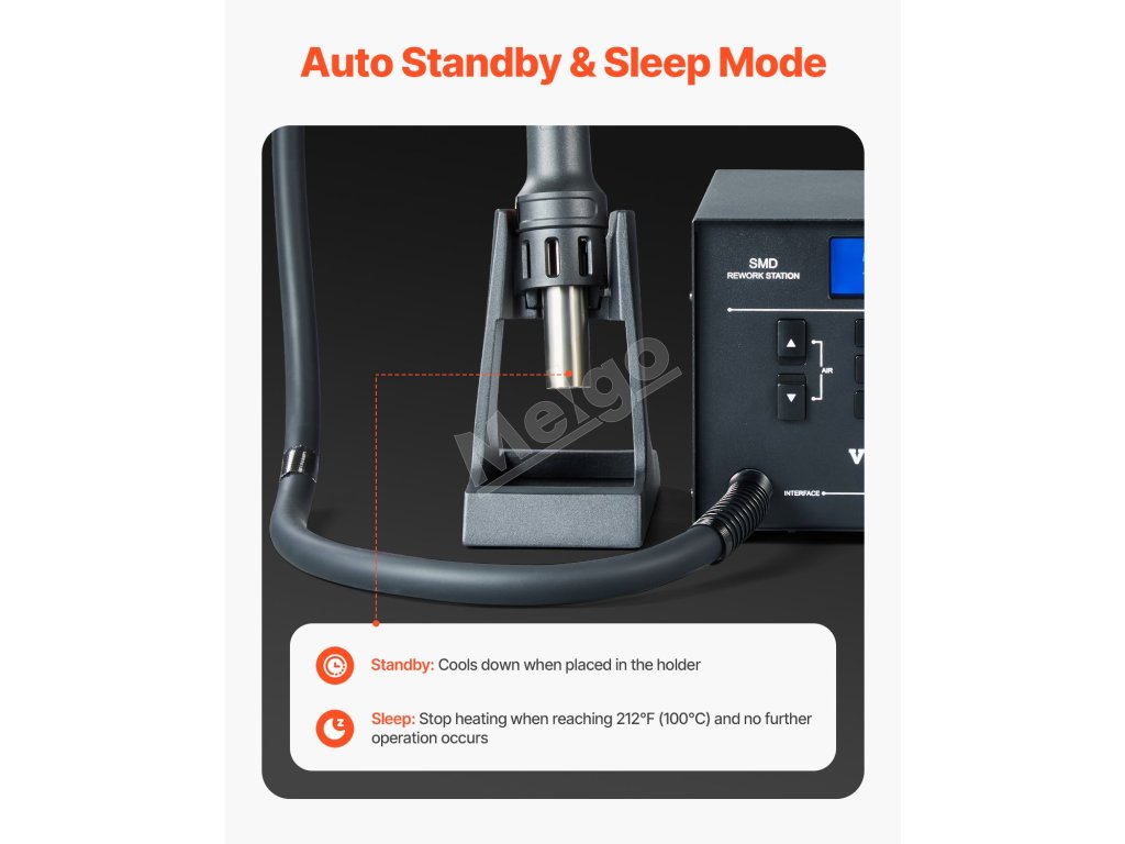 Automatický pohotovostný režim a režim spánku zvyšujú bezpečnosť práce! Premyslené funkcie nielenže chránia vykurovací prvok a predlžujú životnosť stanice, ale pomáhajú aj predchádzať náhodným popáleninám, čím poskytujú bezpečnejšie a efektívnejšie prepracovanie.